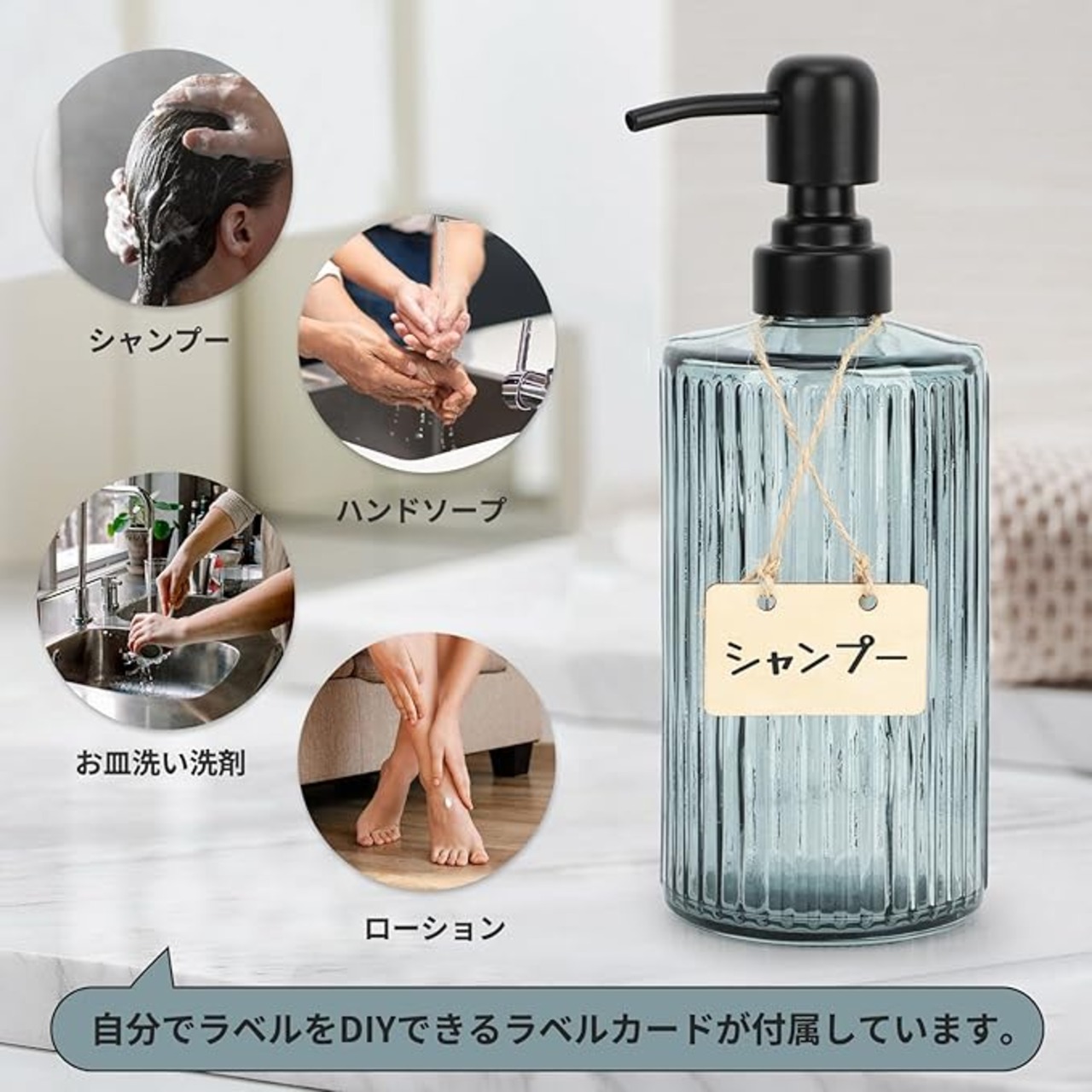 Segbeauty ディスペンサー 詰め替えボトル ガラス製 シャンプーボトル 500ML おしゃれ 洗剤用 お風呂 温泉 トイレ キチン DIYラベルカード付き (グレー)