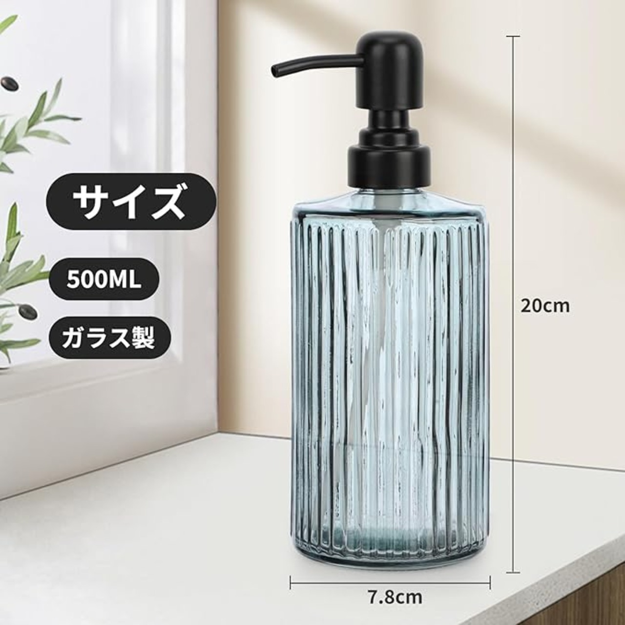 【製品仕様】幅7.5cm 高さ20cm、ガラス製。頻繁に触れる重要なポンプ部分には錆びにくい304ステンレスを採用し、製品の耐久性向上を目指しています。