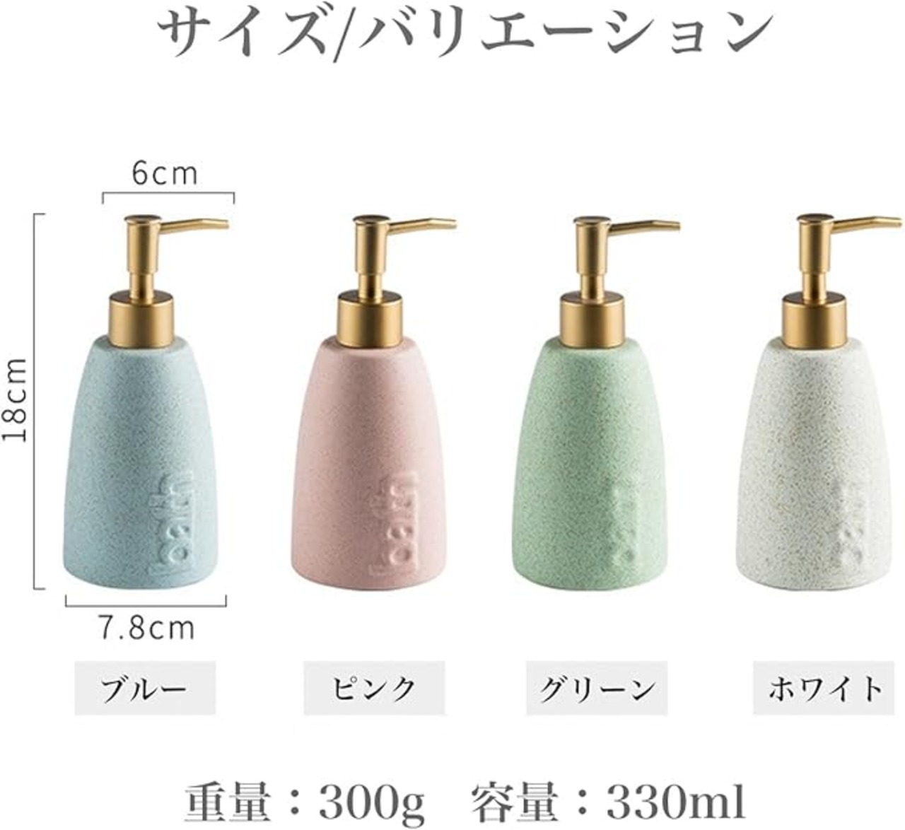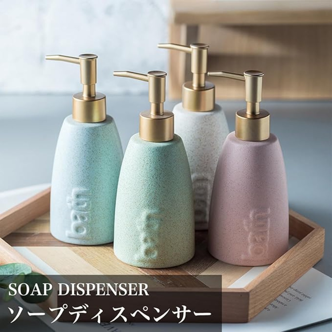 お洒落な砂デザインのソープディスペンサーです。扱いやすい液体タイプのボトルで、どんな場所にも馴染むサイズデザインです。滑らかな曲線とエレガントなゴールドポンプが特長で、バスルームをワンランクアップさせてくれます。カラーバリエーションはブルー、ピンク、グリーン、ホワイトの4色展開。実用性とデザイン性を兼ね備えたこの商品で、日々の生活に少しの贅沢をプラスしてくれます。
