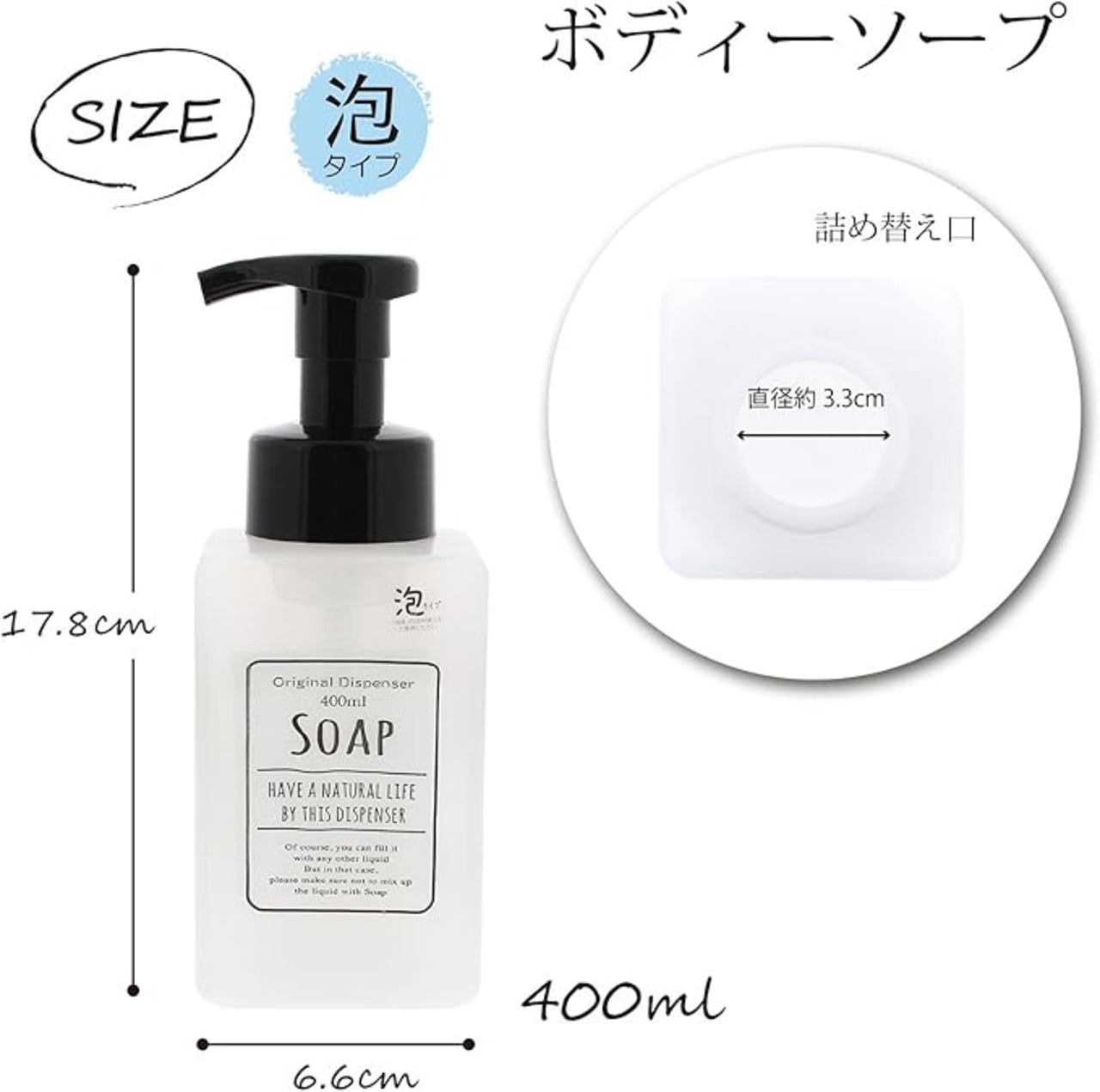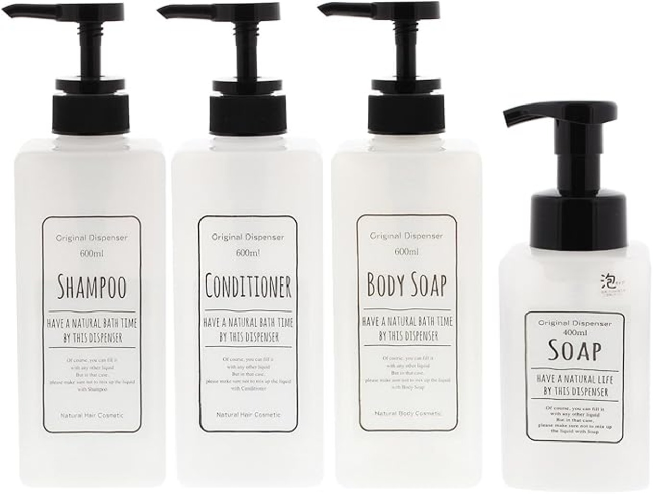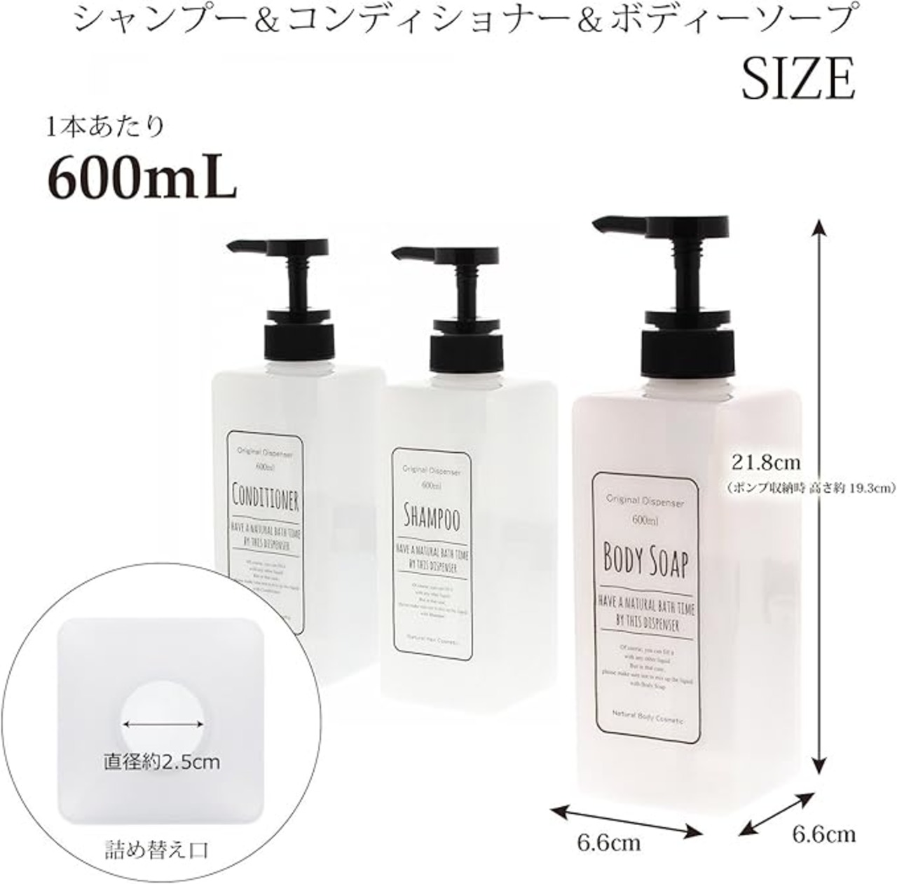 リビング ディスペンサー ポンプボトル スクエア シャンプー&コンディショナー&ボディーソープ ホワイト 600ml 3個 ソープボトル 400ml 1個 (泡タイプ) 、計4個セット