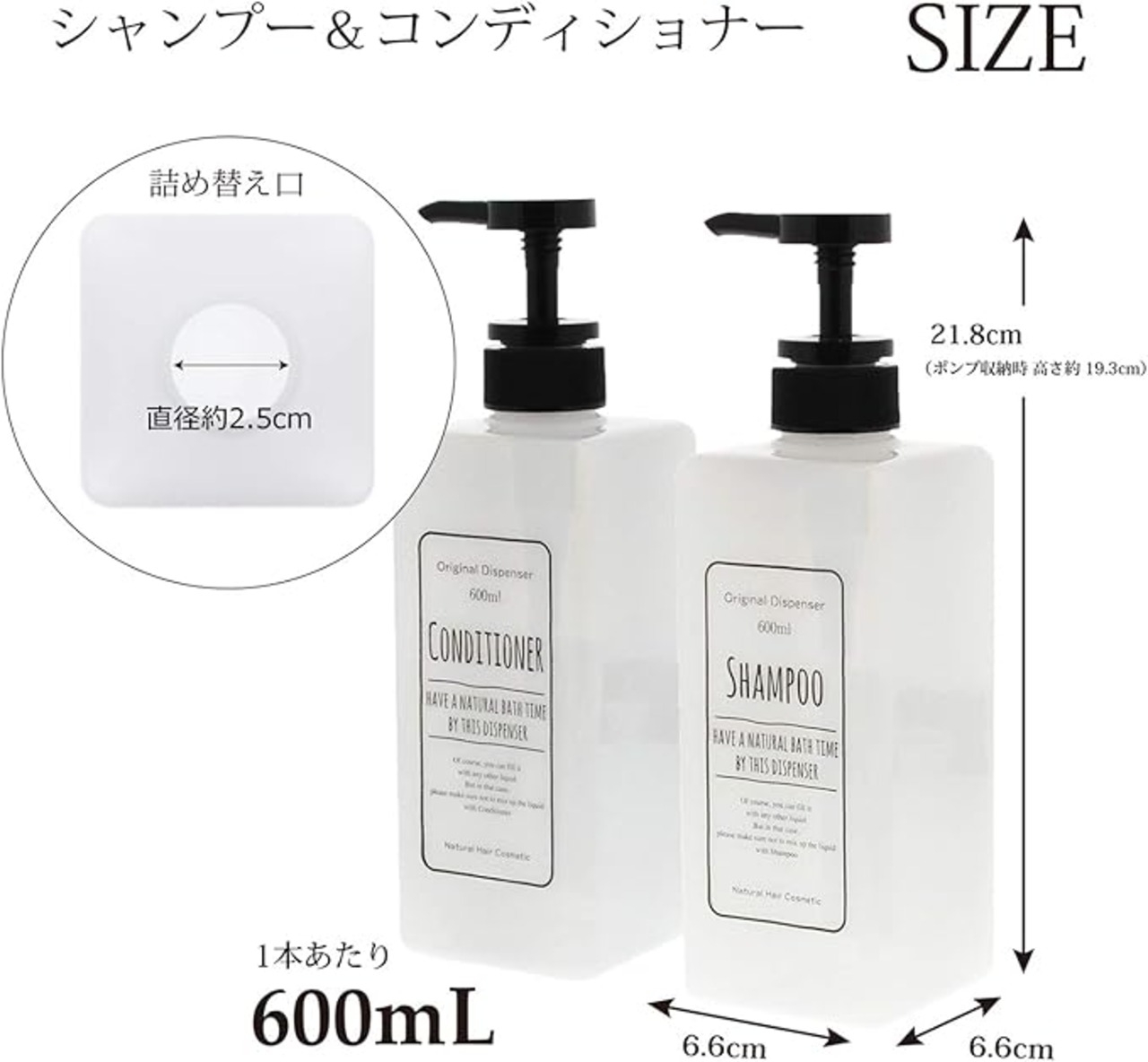 リビング ディスペンサー ポンプボトル スクエア シャンプー&コンディショナー ホワイト 600ml 2個 ソープボトル 400ml 1個 (レギュラータイプ)、計3個セット