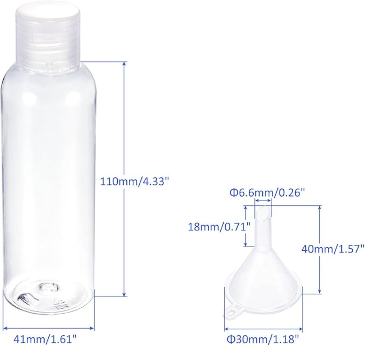 パッケージに含まれるもの:3個のトラベルボトルと1個の漏斗、ボトルのサイズは41mm x 110mm / 1.61" x 4.33"(直径 高さ)で、容量は120mlです。漏斗の底のサイズは6.6mm x 18mm / 0.26" x 0.71"(直径 高さ)で、漏斗の上部の直径は30mm / 1.18"、高さは40mm / 1.57"です。