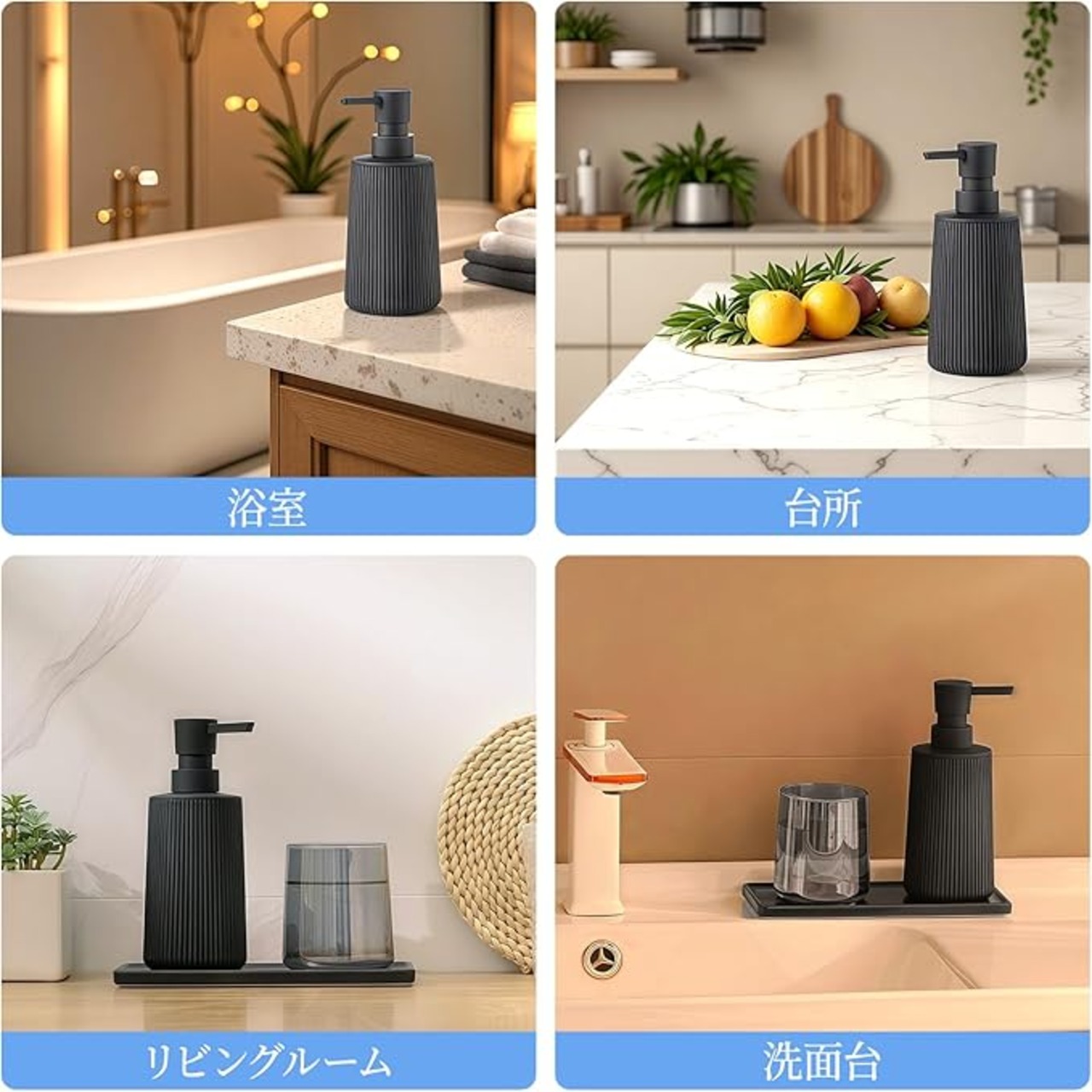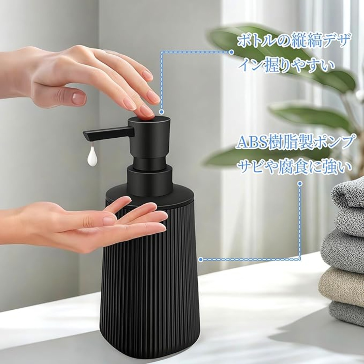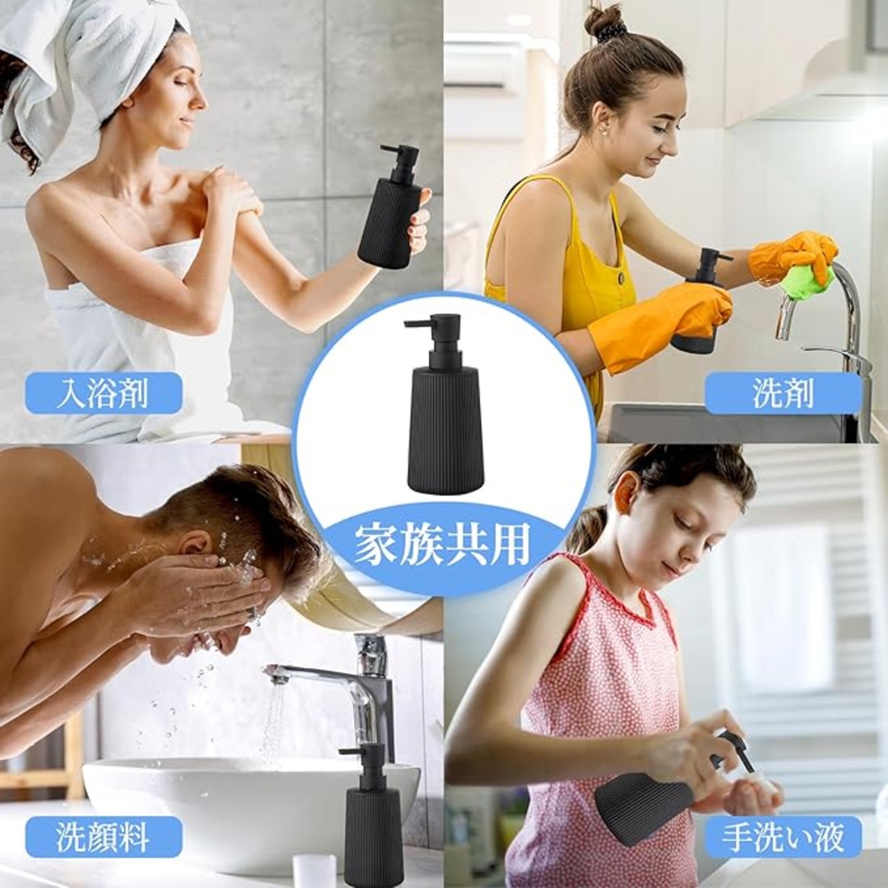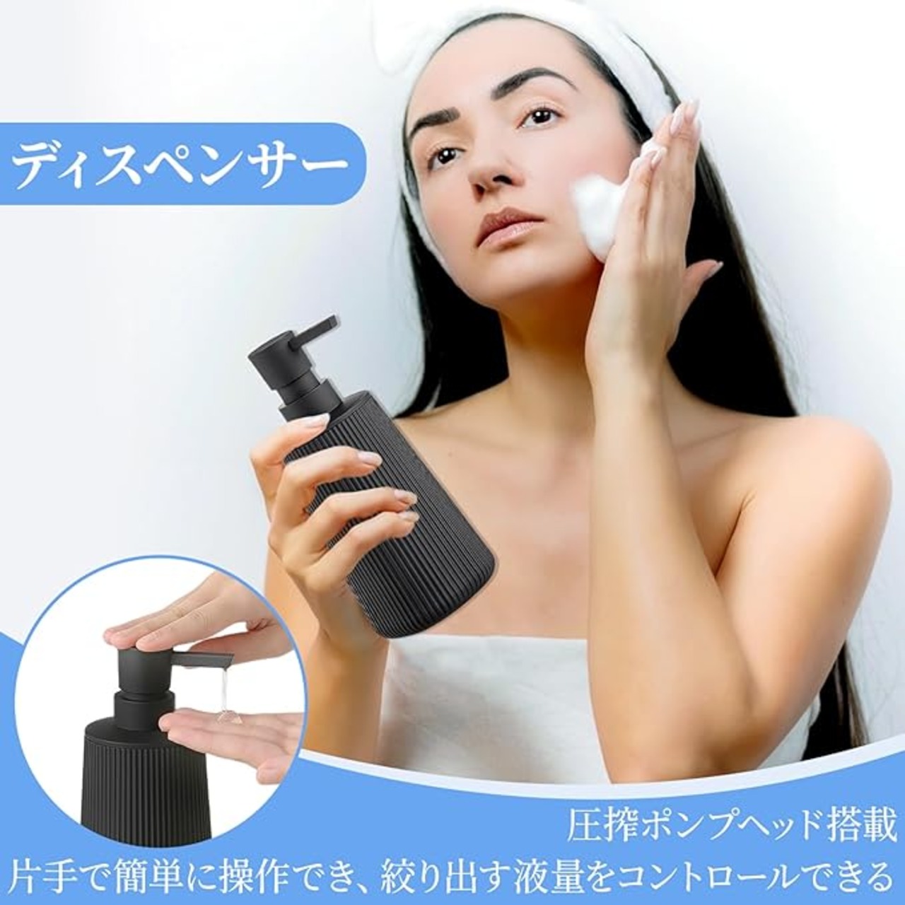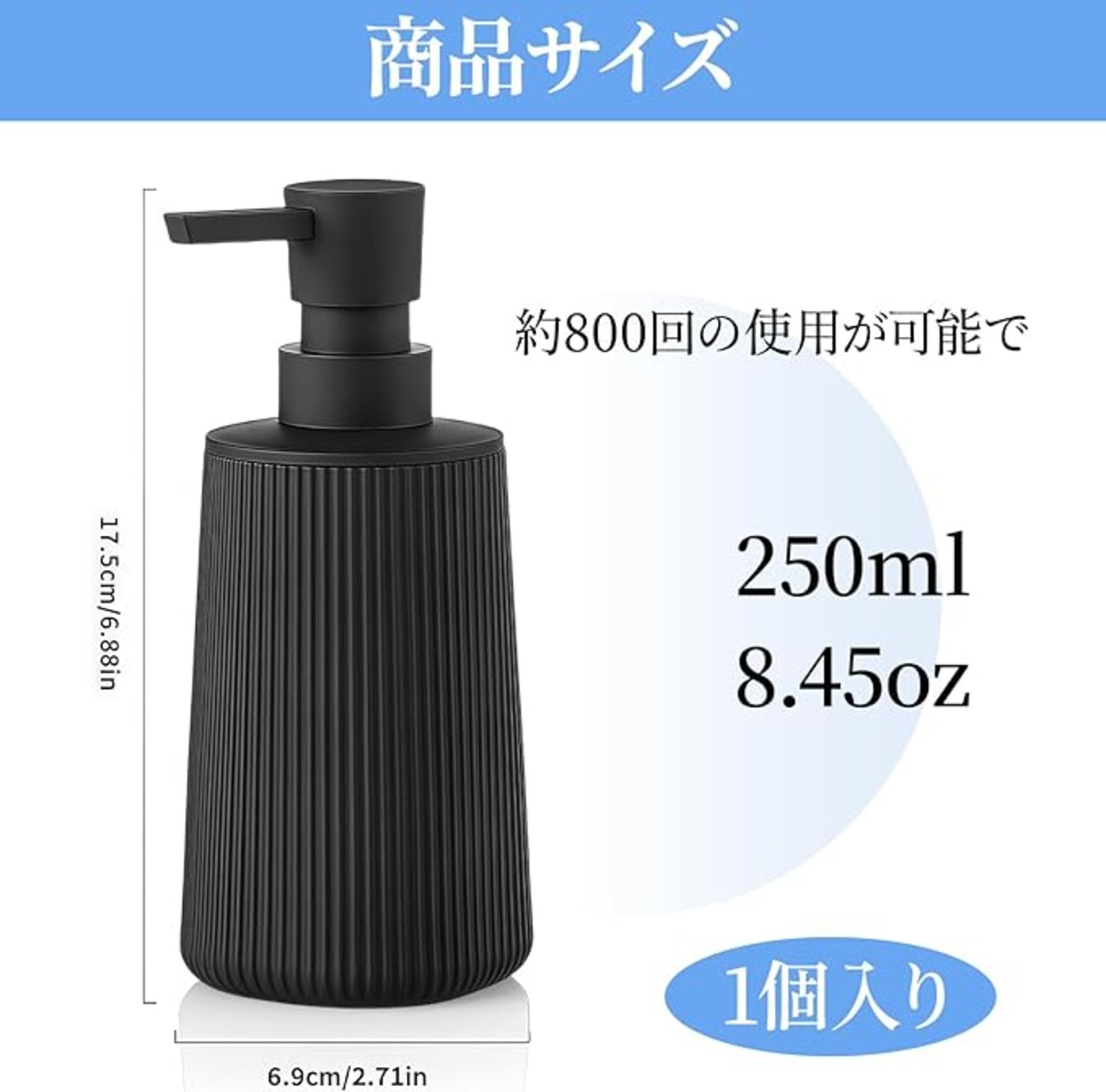 【洗練されたバスルームスタイリング】 シンプルな円柱形のシャンプーボトルが、モダンなバスルーム空間を演出。洗練されたブラックカラーが上質な雰囲気を醸し出し、洗面台周りをすっきり統一。スリムな形状が狭いスペースでも圧迫感なくフィットし、複数並べても美しい調和を生みます。光沢感のあるボディが高級感をプラス、日々の洗面時間をより特別な瞬間へと変えるデザインです。