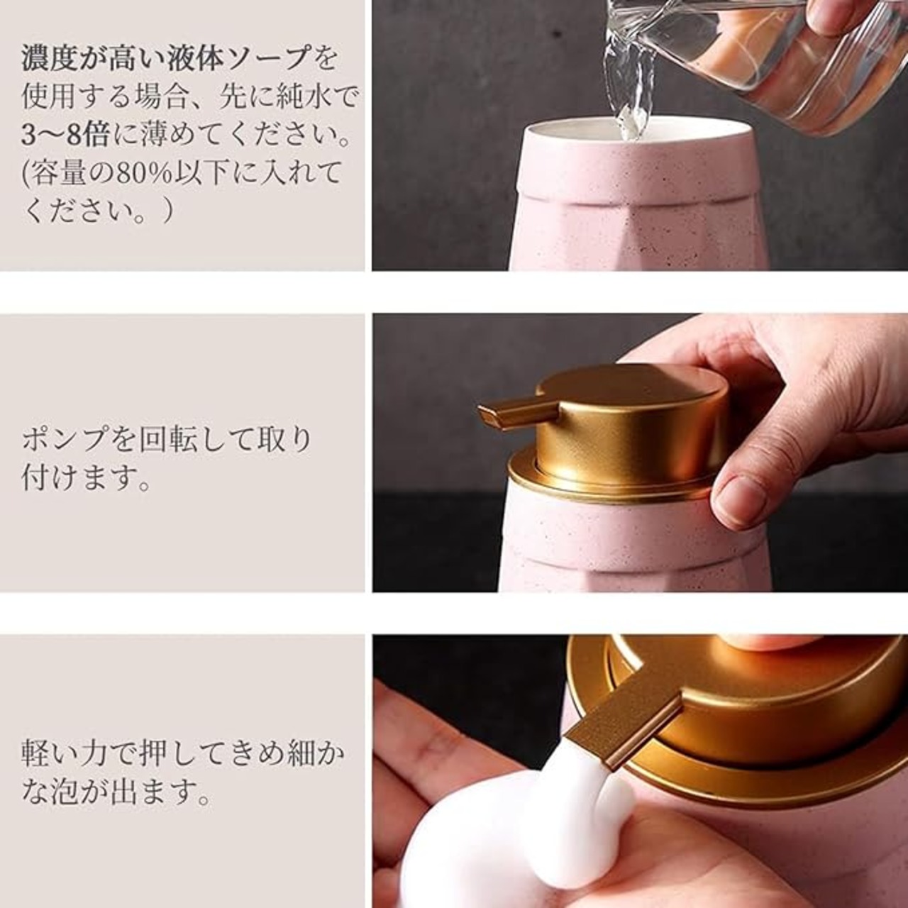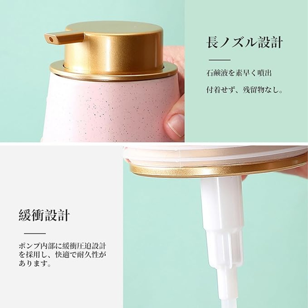 【セラミック製ソープボトル】良質のセラミックのボトル、プラスチック製より洗いやすく劣化しません。梨地の釉面工芸、北欧風のデザイン感です。マットな質感のポンプ、肌触りが心地よいし、水染みが残りません。