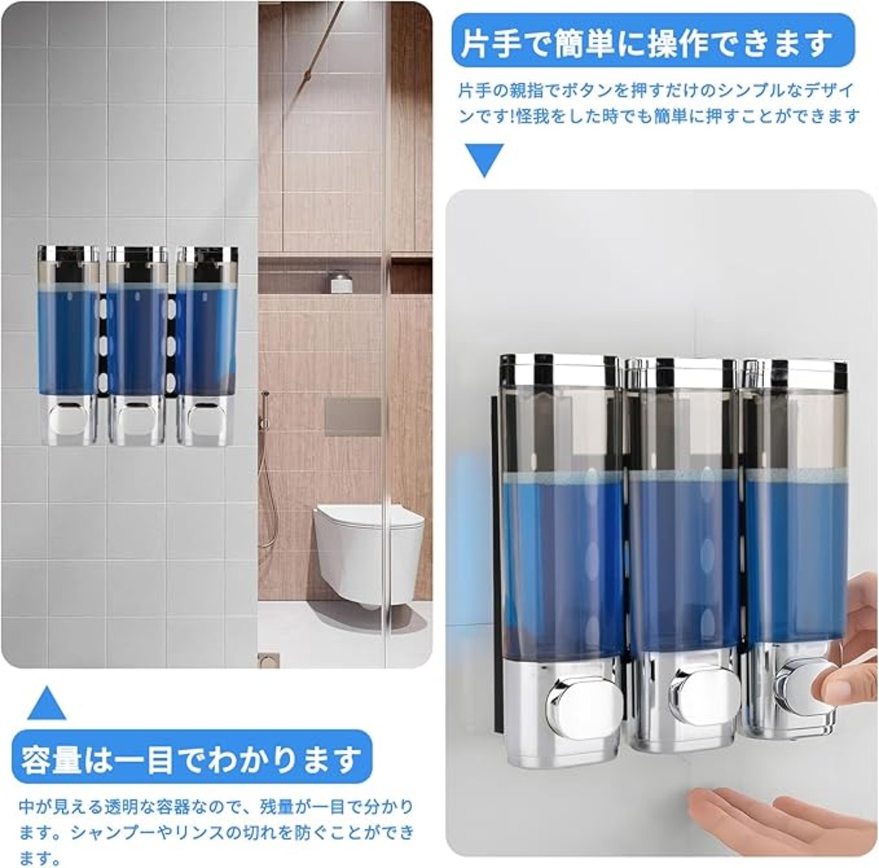 大容量設計: 各ディスペンサーは300mlの容量を持ち、3本セットで合計900mlの収納が可能です。透明な容器で残量が一目で確認できます