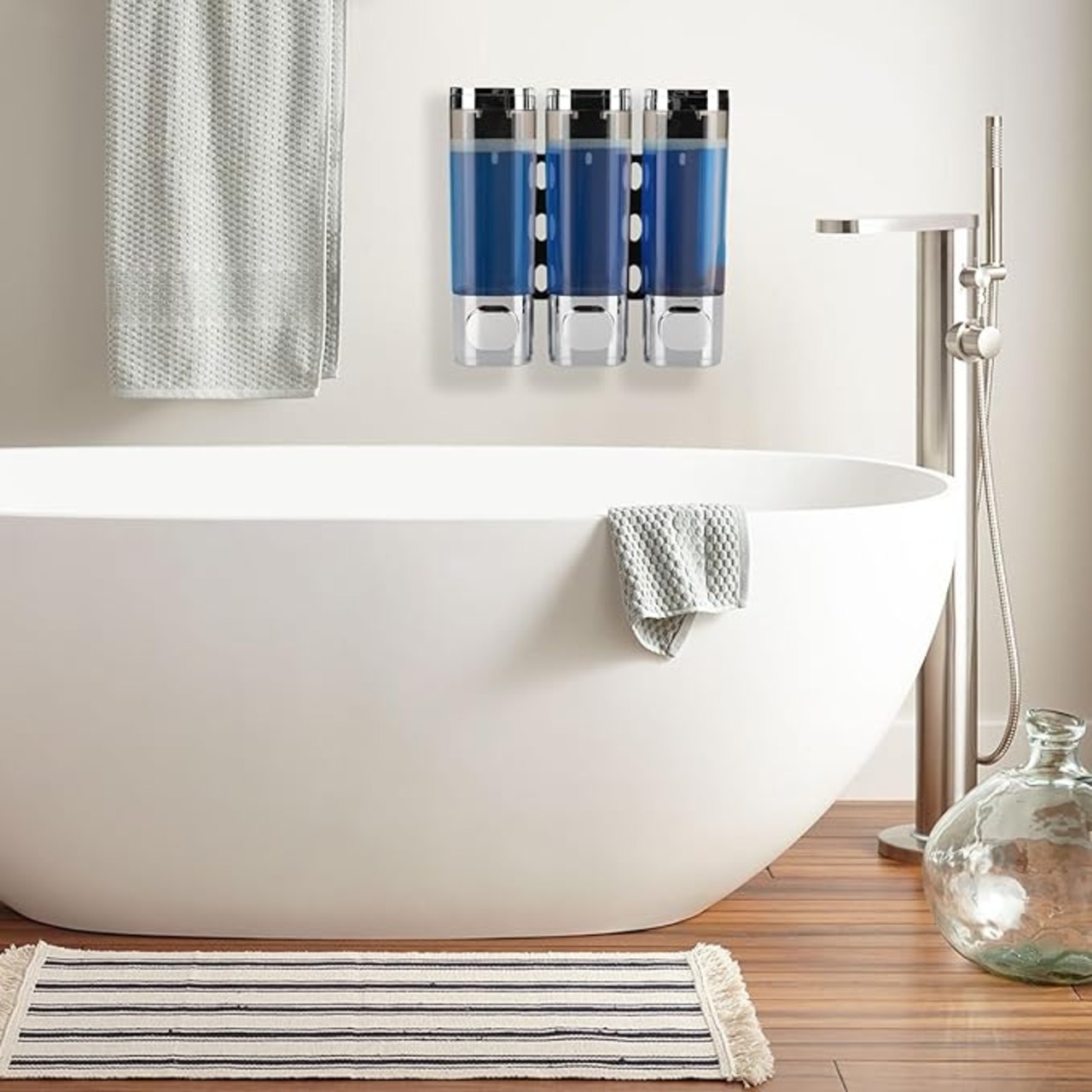 スタイリッシュで使いやすい壁掛け式シャンプーディスペンサーです。3連タイプで、シャンプー、コンディショナー、ボディーウォッシュを一括収納できます。各ボトルの容量は300mlで、透明な本体により残量が一目で確認できます。高品質なABS素材を使用し、耐久性に優れています。片手でも簡単に操作できる押しボタン式で、濡れた手でも扱いやすい設計です。浴室の壁面に強力マグネットで取り付けられ、安定した設置が可能です。ボトルの幅は6.5cm、高さは21.5cm、3連での全長は20cmとコンパクトなサイズです。エレガントなデザインで、モダンな浴室にマッチします。清潔感のあるクリアボトルとシルバーの組み合わせが、バスルームを上質な空間に演出します。