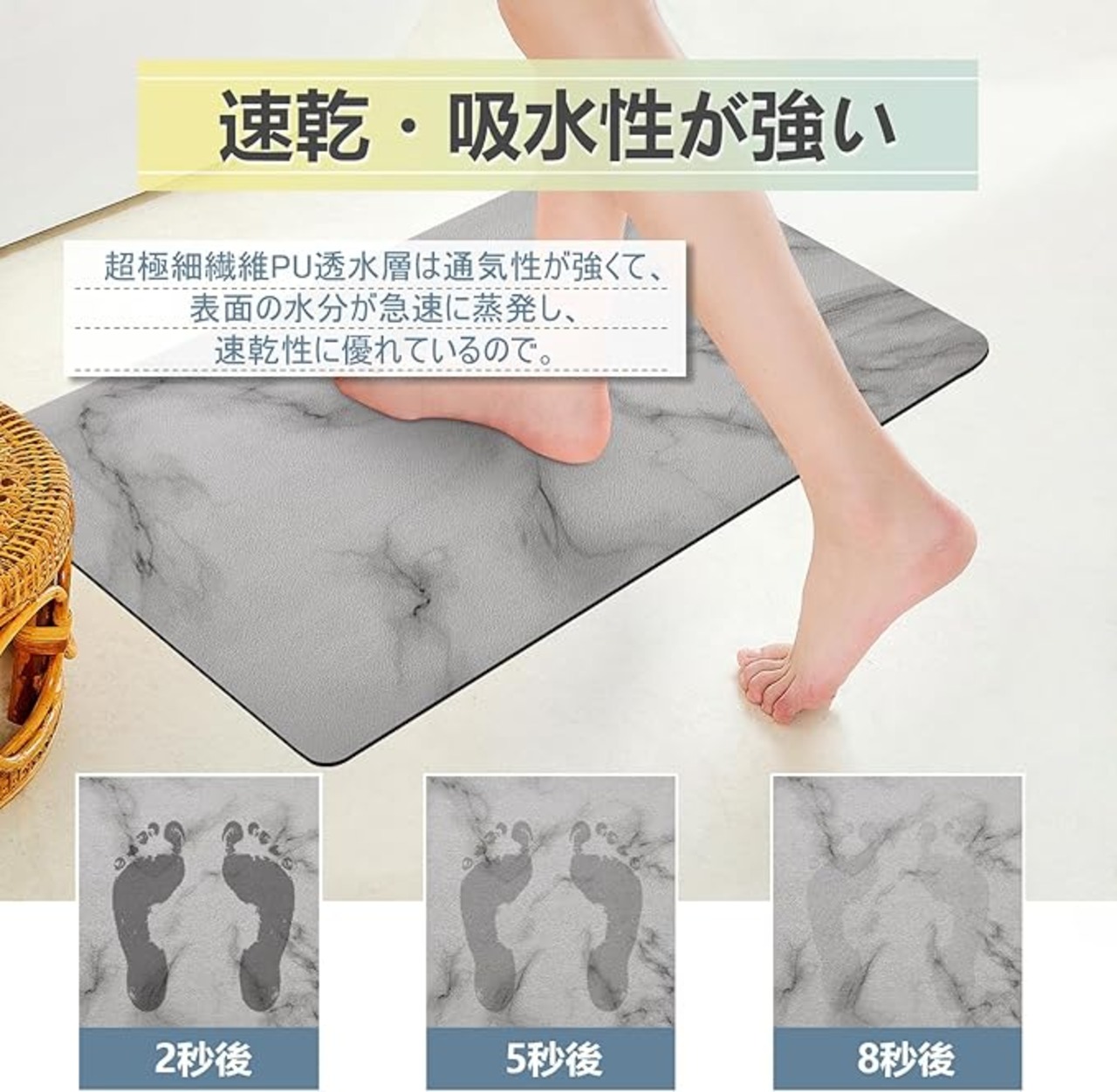 ★【吸水性・速乾性】ソフト珪藻土バスマットは 吸水力に優れ、お風呂上りの濡れた足元の水滴を逃さず、すばやく吸い取りします。超極細繊維PU透水層は通気性が良く、表面の水分が急速に蒸発し、速乾性に優れているので、湿気による細菌の繁殖も抑えます。