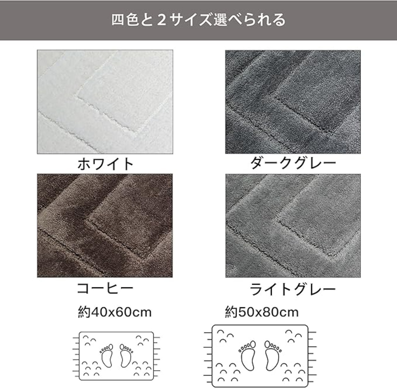 【カラーとサイズ】浴室を落ち着いた雰囲気、汚れが目立ちにくい、ホワイト、ダークグレー、ライトグレー、ブラウンの4色採用しました。サイズは一般的な浴槽に合わせて40 60cmと50 80cmの2展開しています。
