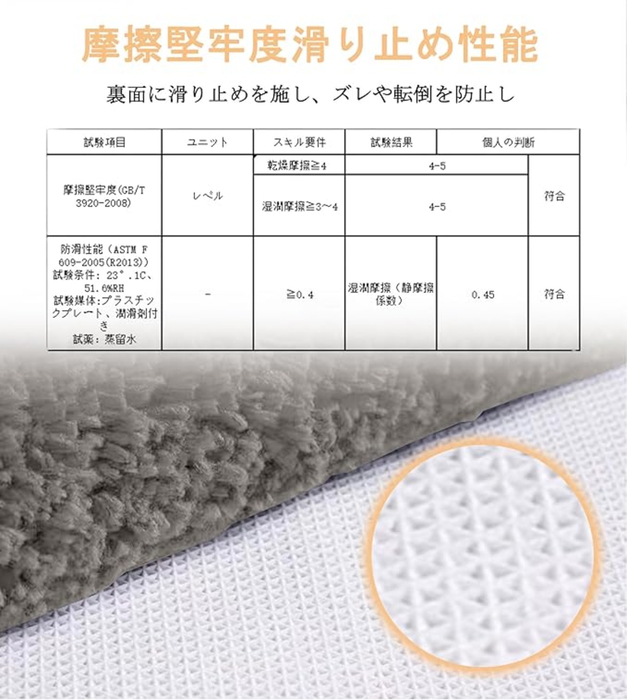 【日本の総合試験機関の速乾性】日本基準の品質試験の結果、吸水性、速乾性の項目でほぼ最高評価であることが証明されました。吸水力は標準バスマットの10倍、速乾性も標準以上です。洗っても色褪せにくいとの特徴を持ち、落ち着いた風合いが保ちます。脱ガム材・非直結式・変色・変形はございません。