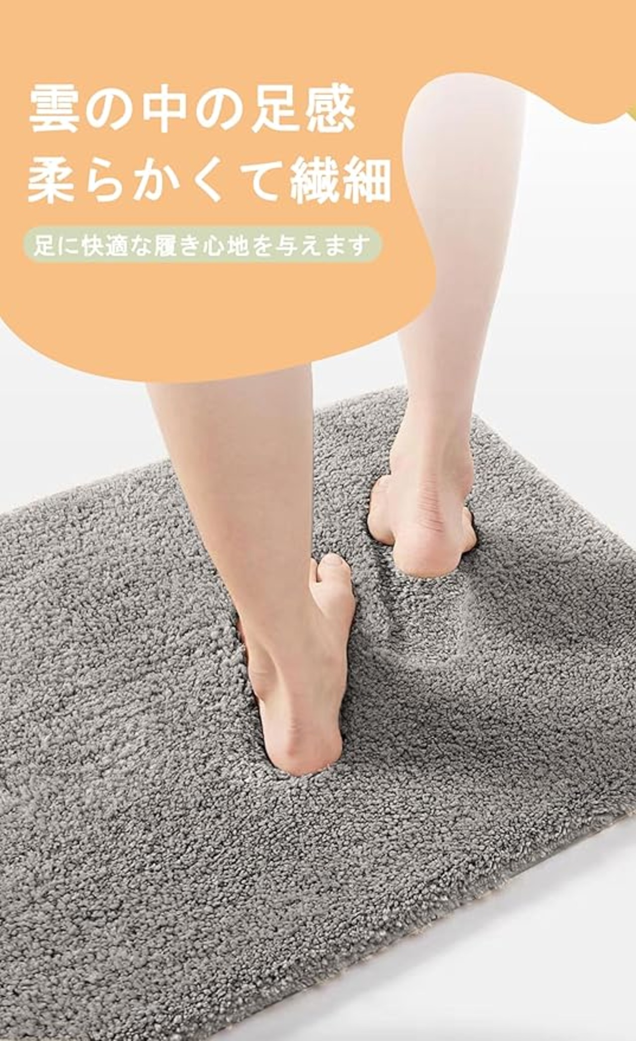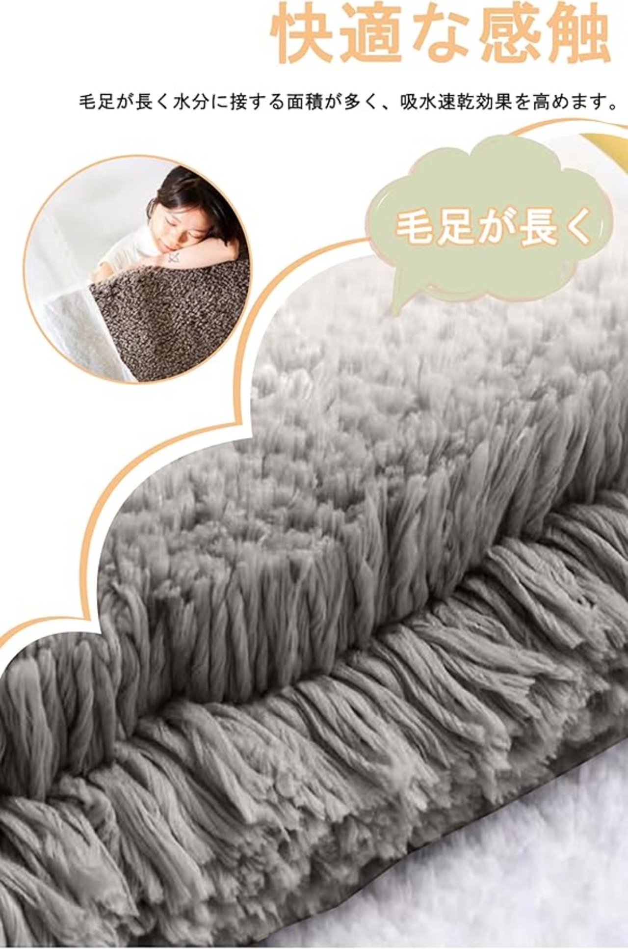 【ふわふわの肌触り人気素材】AYOの浴室用滑り止めマットはふわふわのマイクロファイバー素材を使用、足元に心地良い感触を与えます。 さらに、大判の起毛生地は従来品の2倍のボリュームを実現し、濃密な長毛が足を包み込むような踏み心地、まるで雲の上を歩くような質感で、足を非常に柔らかくサポートします。疲れた足を落ち着かせてくれます。圧縮してお送りさせていただいているため、開封時にサイズの誤差が生じる可能性がございます。ご了承ください。洗濯時には何度か伸ばして干していただきますようお願いいたします。