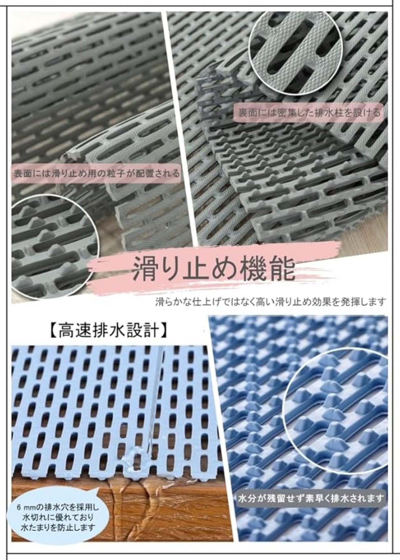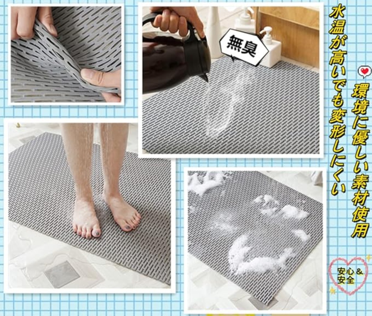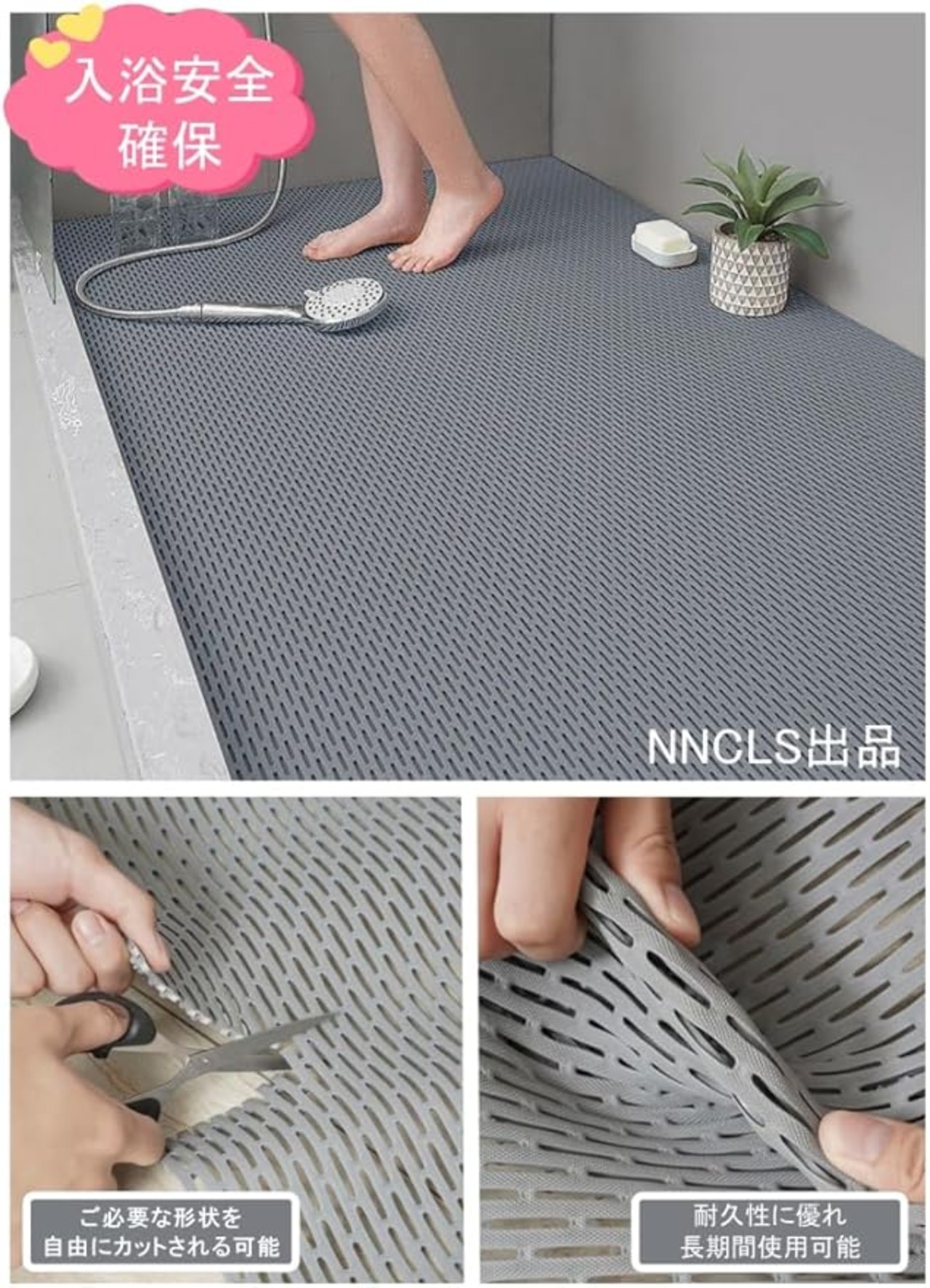 【入浴安全の確保】高い滑り止め性能により転倒事故を防止するだけでなく、浴室の床を保護する役割も果たします。特に高齢者や乳児を抱えての入浴時など、滑りやすい浴室での不安を軽減するのに適しています。
