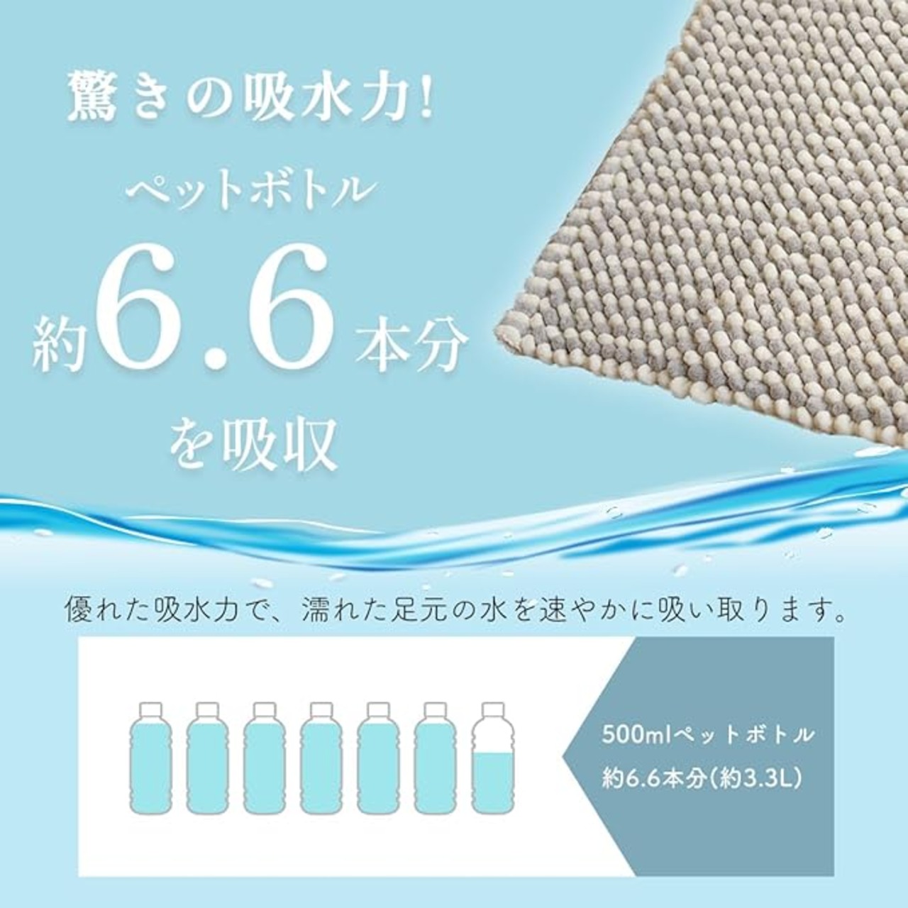 【吸水力抜群】500mlペットボトル約6.6本分(約3.3L)の吸水力!バスマット・キッチンの水回りなど様々な場所でお使いいただけます。