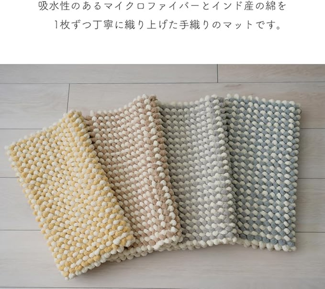 吸水性のあるマイクロファイバーとインド産の綿を1枚ずつ丁寧に織り上げた手織りのマットです。