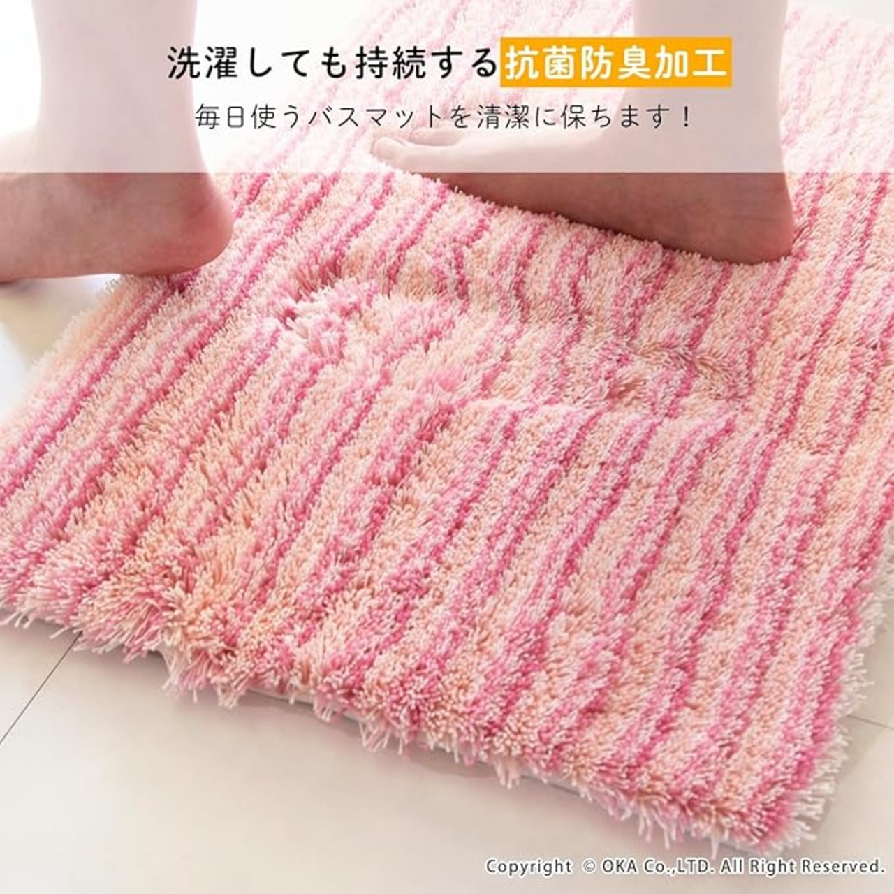 シリーズ販売30年以上続くロングセラー、2人目、3人目もびしょびしょしない!乾度良好Ⓡバスマット「乾度良好Ⓡアップフィールド」。濡れても濡れても、すぐ吸って乾くサラサラな乾度良好Ⓡバスマットは、家族が使ったあとのバスマットを使うとヒヤッとするお悩みを解決します。温浴施設などでもご利用いただき、おかげ様でたくさんの方にご好評のお声をいただき愛されています。特殊構造繊維を使用しているので吸水速乾に優れ、抗菌防臭加工付きの機能性にも優れた1枚です。それぞれ同系色のカラーで描かれたボーダー柄デザインが、ポップな印象で可愛い仕上がりになっています。バスルームや洗面所をパッと明るくしてくれる爽やかなピンク系とグリーン系の2色展開です。どこか懐かしい、レトロ感を感じさせる雰囲気で空間のアクセントにもなります。