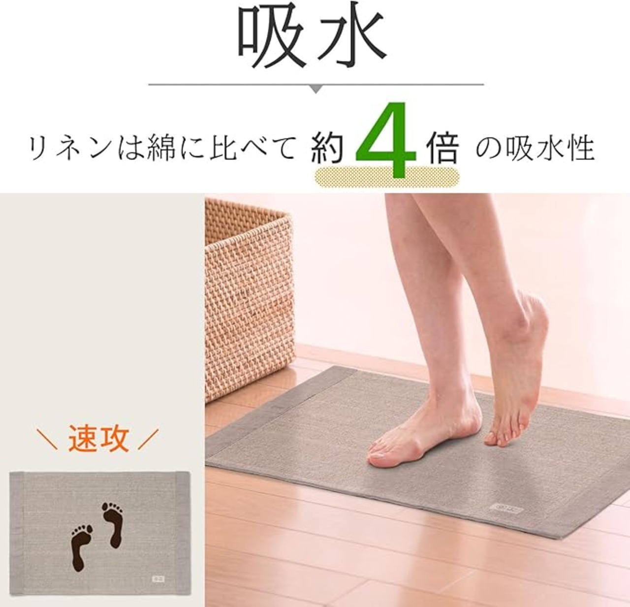 【優れた吸水性と速乾性】リネンは綿と比較して吸水性は約4倍、速乾性は約2倍といわれ、お風呂場などの水回りには最適の素材です。
