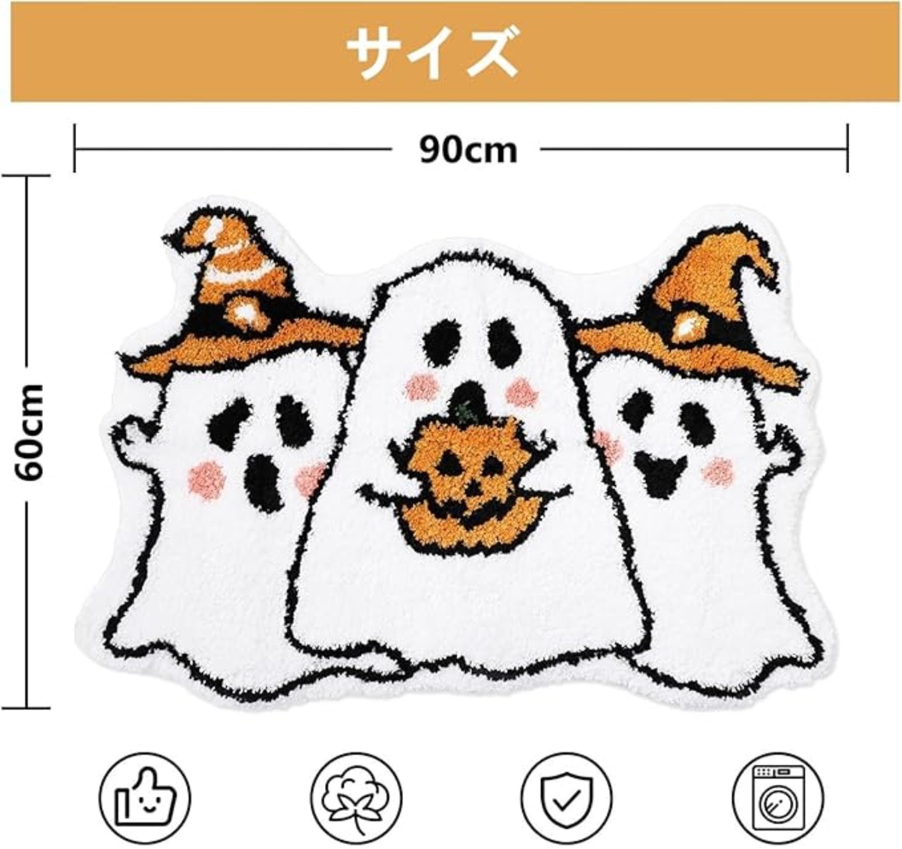 「季節感たっぷりのハロウィンデザイン」:可愛い幽霊柄が印象的で、バスルームやトイレ、キッチンなどに置くだけでハロウィンの雰囲気がぐっと高まります。お子様や来客にも好評のデザインです。