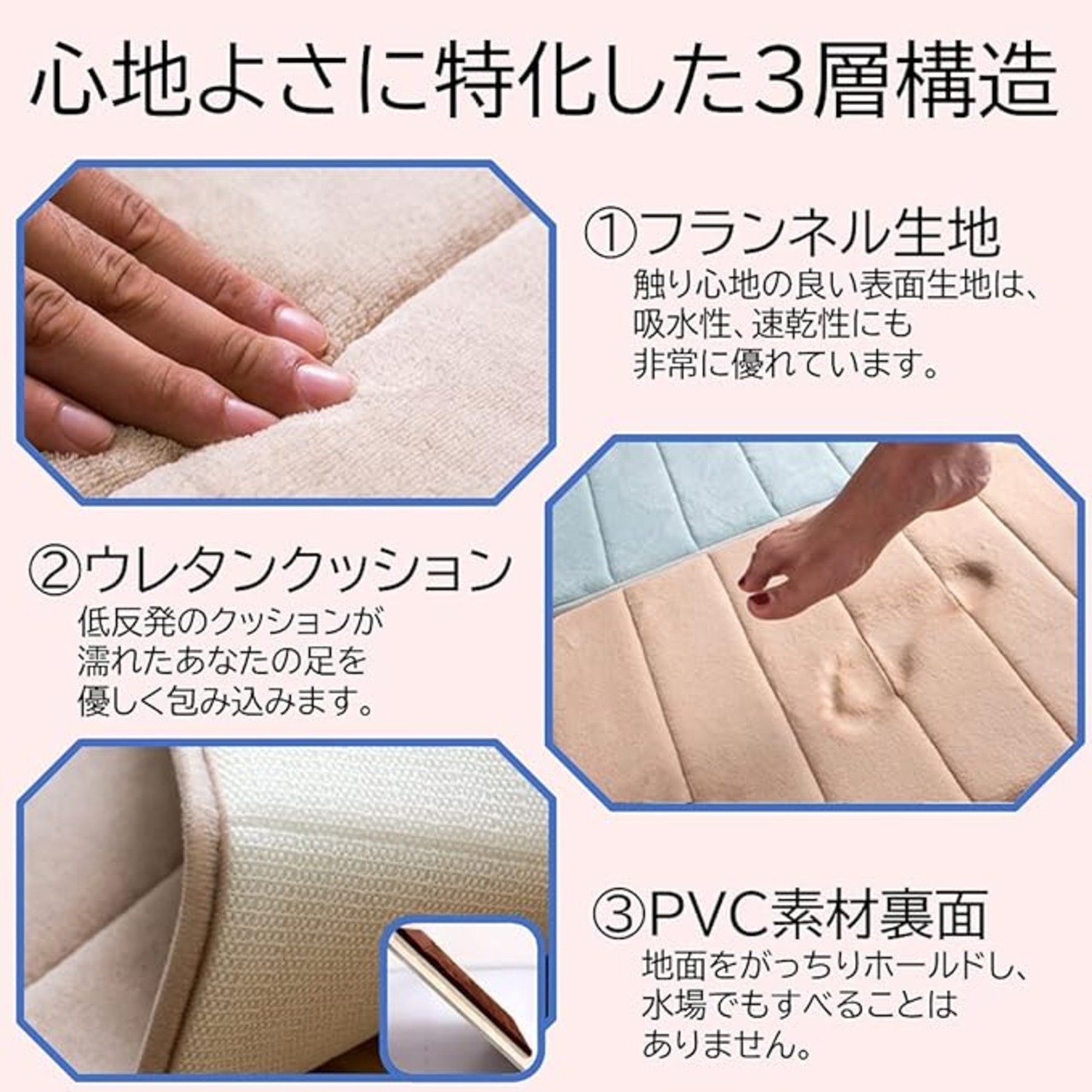 【3層構造】さわり心地の良いふわふわの表面生地、低反発のウレタンクッション、地面をがっちりホールドするPVCの滑り止め素材が、あなたの足を優しく包み込みます。