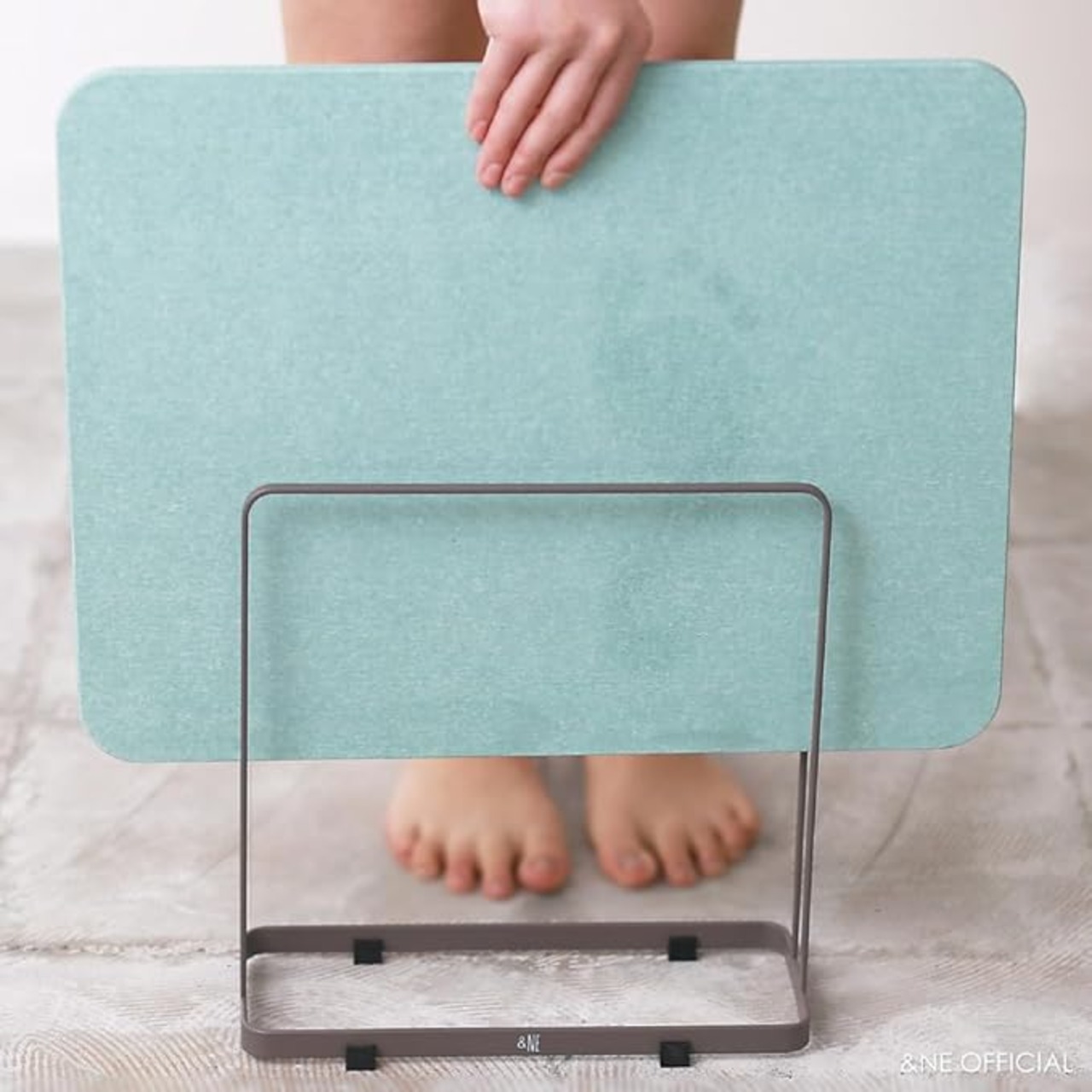 敷きっぱなし、不安定な立てかけを防ぐ、珪藻土バスマット専用の収納スタンドです。床、壁に触れずに乾燥でき、衛生的です。スリムなので家具の隙間にもスッキリ収納。