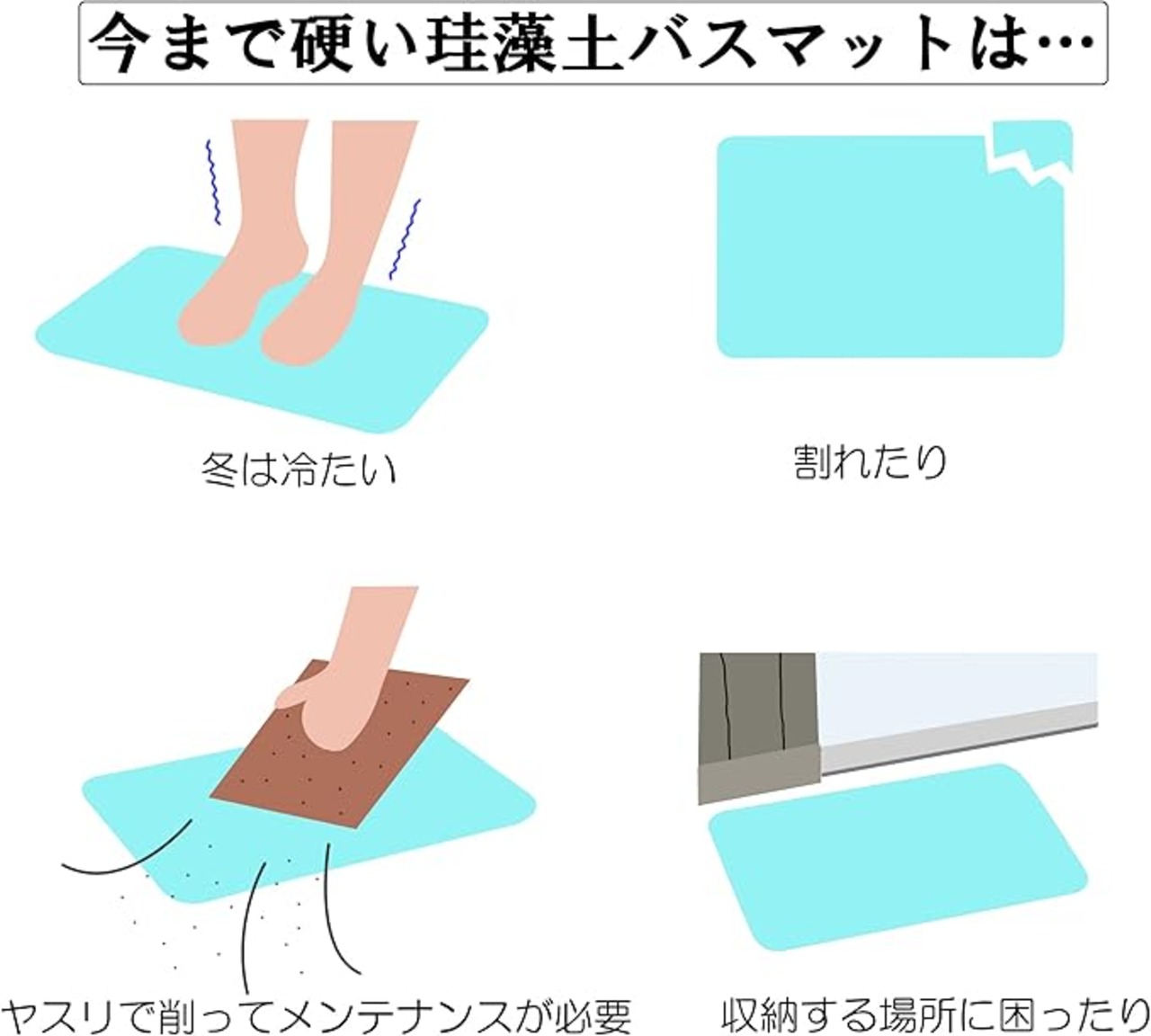 【備考】本来の用途以外では使用しないでください。 直接水やお湯のかかる場所や浴室内に持ち込んで使用しないください。 色のついた水分を吸収した場合はシミとして残る可能性がございます。 使用後はよく乾燥させてください。ゴム製品の為乾燥させる場合は陰干しを行ってください。 天日干し、暖房機、乾燥機では乾かさないでください。 開封後に珪藻土や天然ゴムの独特な臭いがすることがございますが、徐々に薄れていくので問題ございません。 バスマットを置く位置は定期的に変更してください。長時間敷いた場合、色落ちや変色する場合がございますので、ご注意ください。