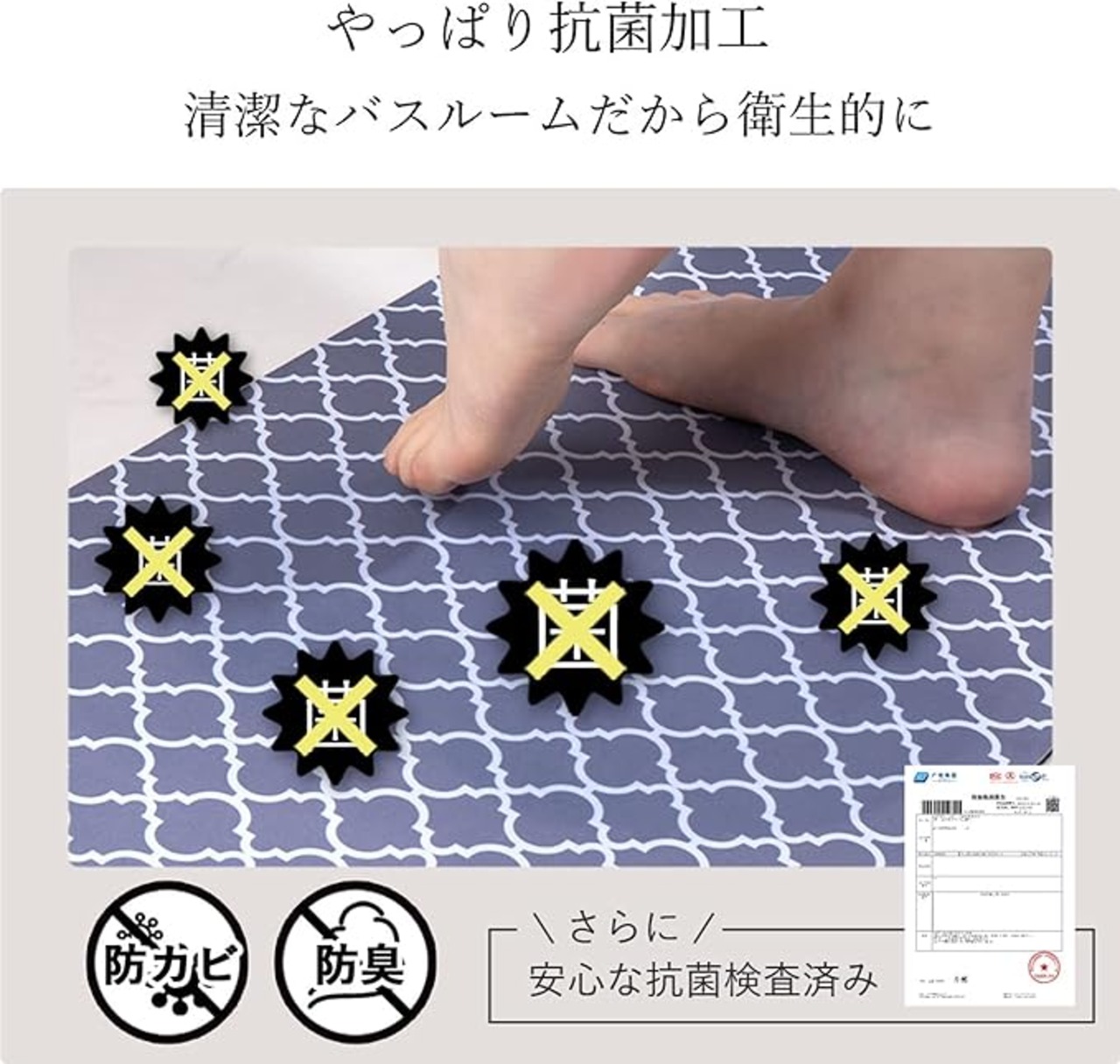 ✅【安全性】珪藻土バスマットは人体に有害なアスベスト(石綿)がでるものがあります。【monet fav珪藻土ソフトバスマット】は国際基準の第三者機関によるアスベスト検査で検出限界値以下という試験結果を得ています。 抗菌性検査も国際基準の第三者機関にて行っており、抗菌性があるという証明を得ております。 バスマットは使用環境上、細菌などが繁殖しやすい場合があります。【monet fav珪藻土ソフトバスマット】は抗菌性に加え、速乾性も高いため最近の繁殖を抑えます。 裏面は滑り止め加工になっておりますので、お風呂場など小さなお子様から、ご年配の方まで幅広くご安心して利用いただけます。