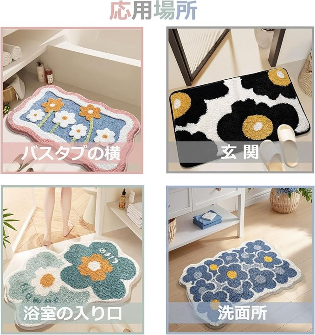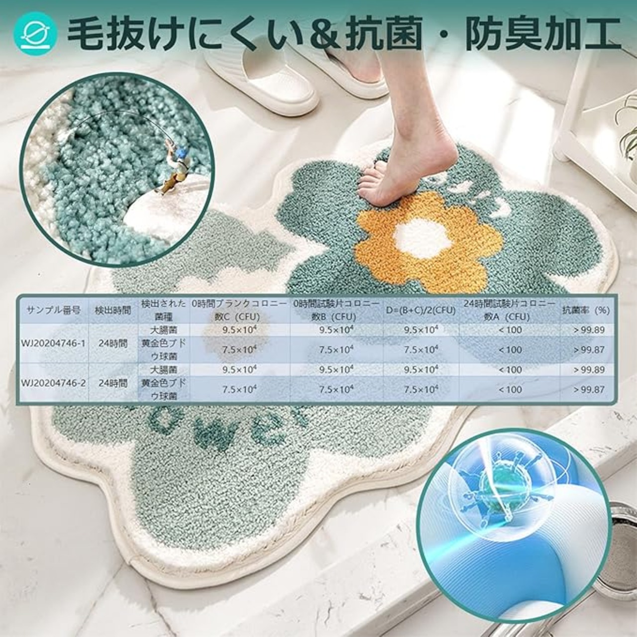 「吸水性と速乾性が優れた風呂マット」バスマットの表面は可愛い小花ような濃密なポリエステルのデザインを採用されて、繊維が瞬間的に水分を吸収でき、お浴の後で、足に残された水滴を吸収し、通気性も抜群で、水分が速く蒸発できます。