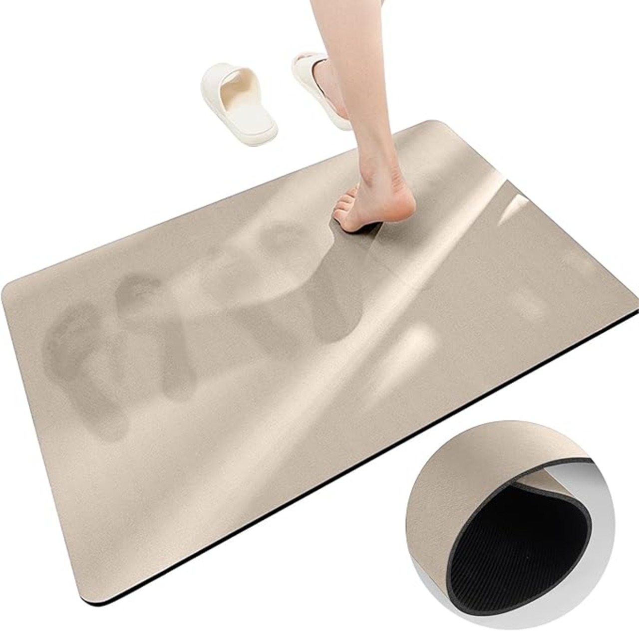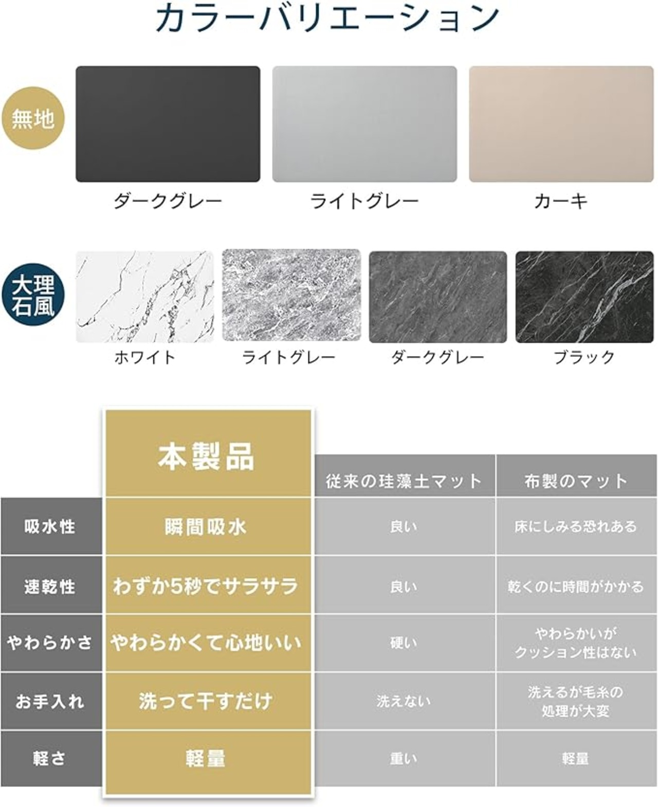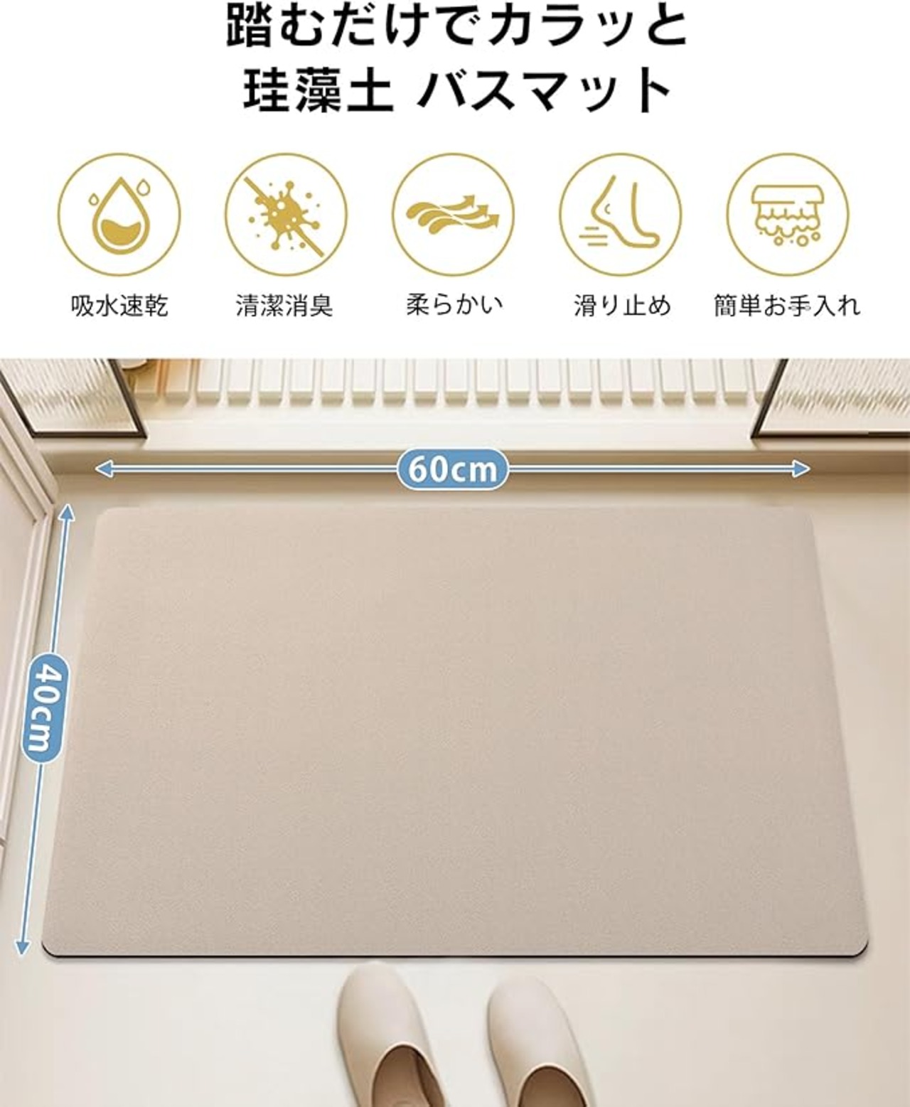 【柔軟で快適なバスマット】 従来の硬い珪藻土バスマットとは一線を画す、柔らかな肌触りと心地よい使用感が特徴です。また、安定した滑り止め効果があり、安全性を確保します。足元へのやさしさと安定感を兼ね備えた究極のバスルームアイテムです。