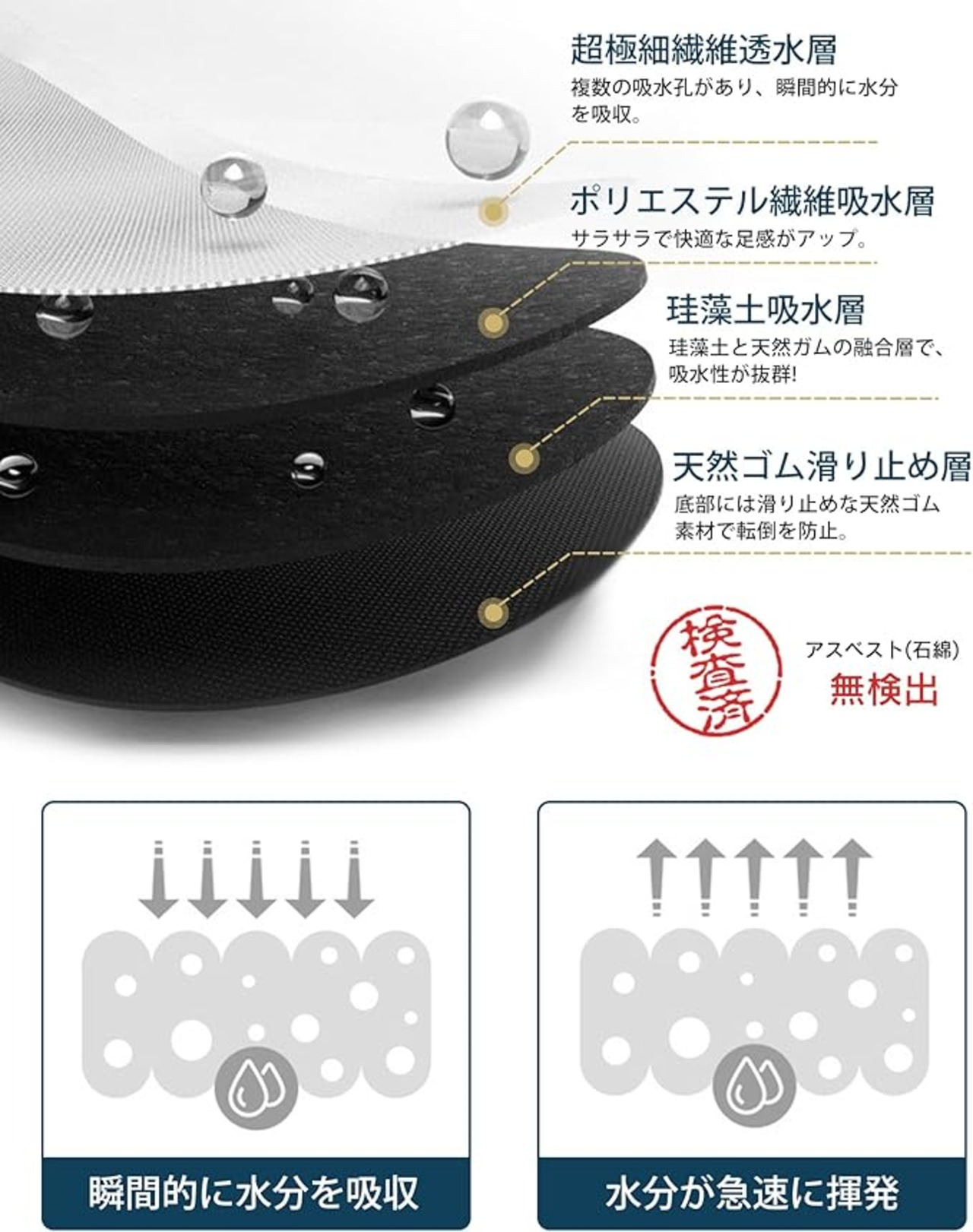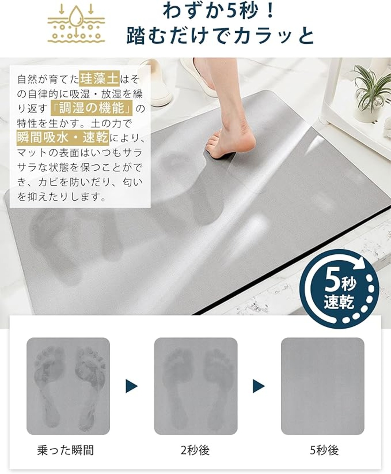 【驚異の吸水力と速乾性】 ソフトな珪藻土バスマットは、優れた吸水性を誇ります。お風呂上りの濡れた足をすばやく乾かし、心地よい乾燥感を提供します。風呂マットは、表面のナノファイバーと珪藻土の微細な孔構造から水分を吸収し、足元をサラサラに保ちます。