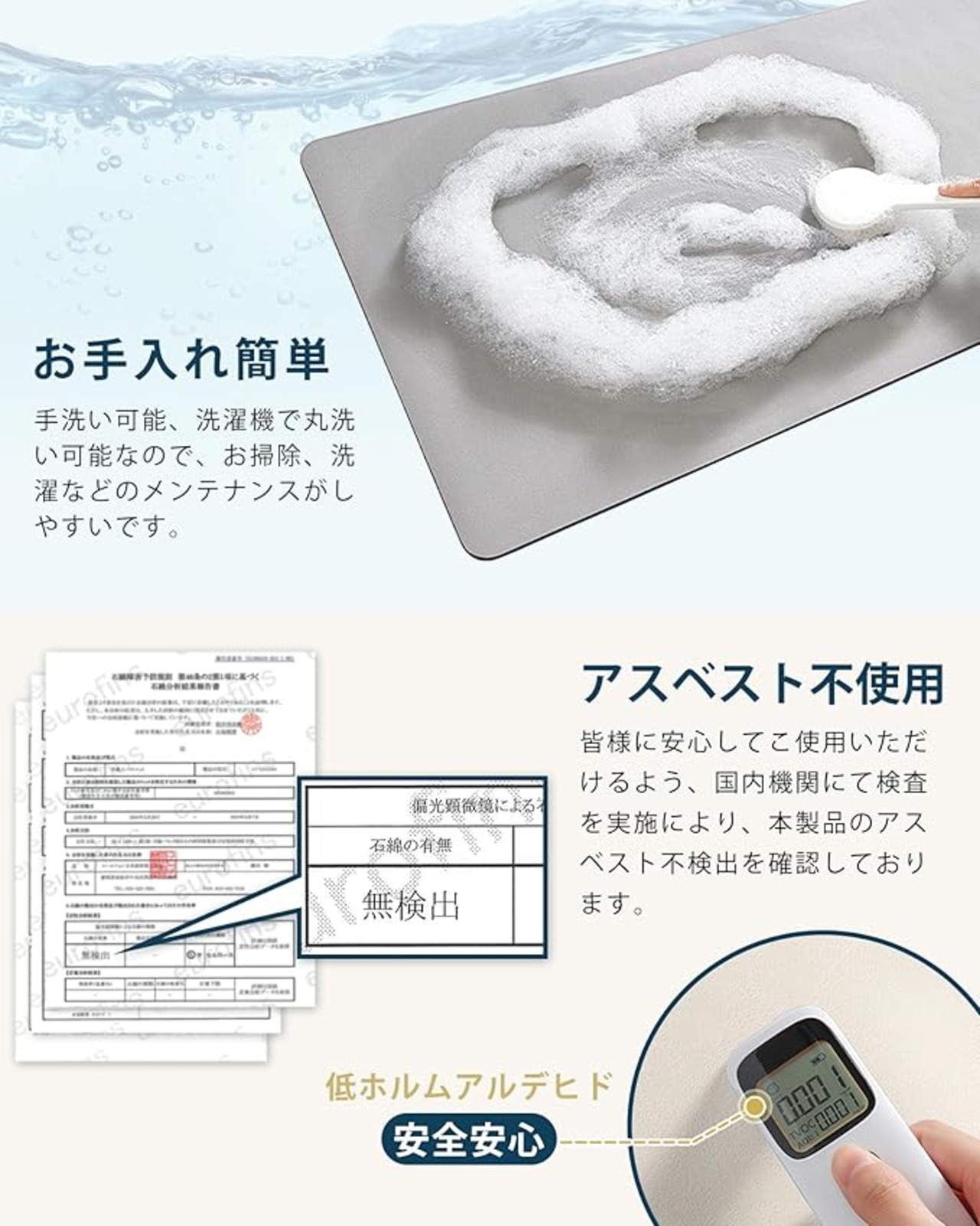 【安心の品質保証&抗菌効果】 当製品は、厳格な品質管理基準に従って検査され、国内認定検査機関でのアスベスト検査をクリアしています。また、抗菌処理済みであり、清潔な環境を保ちます。安全性と品質に対する私たちの取り組みにご安心ください。