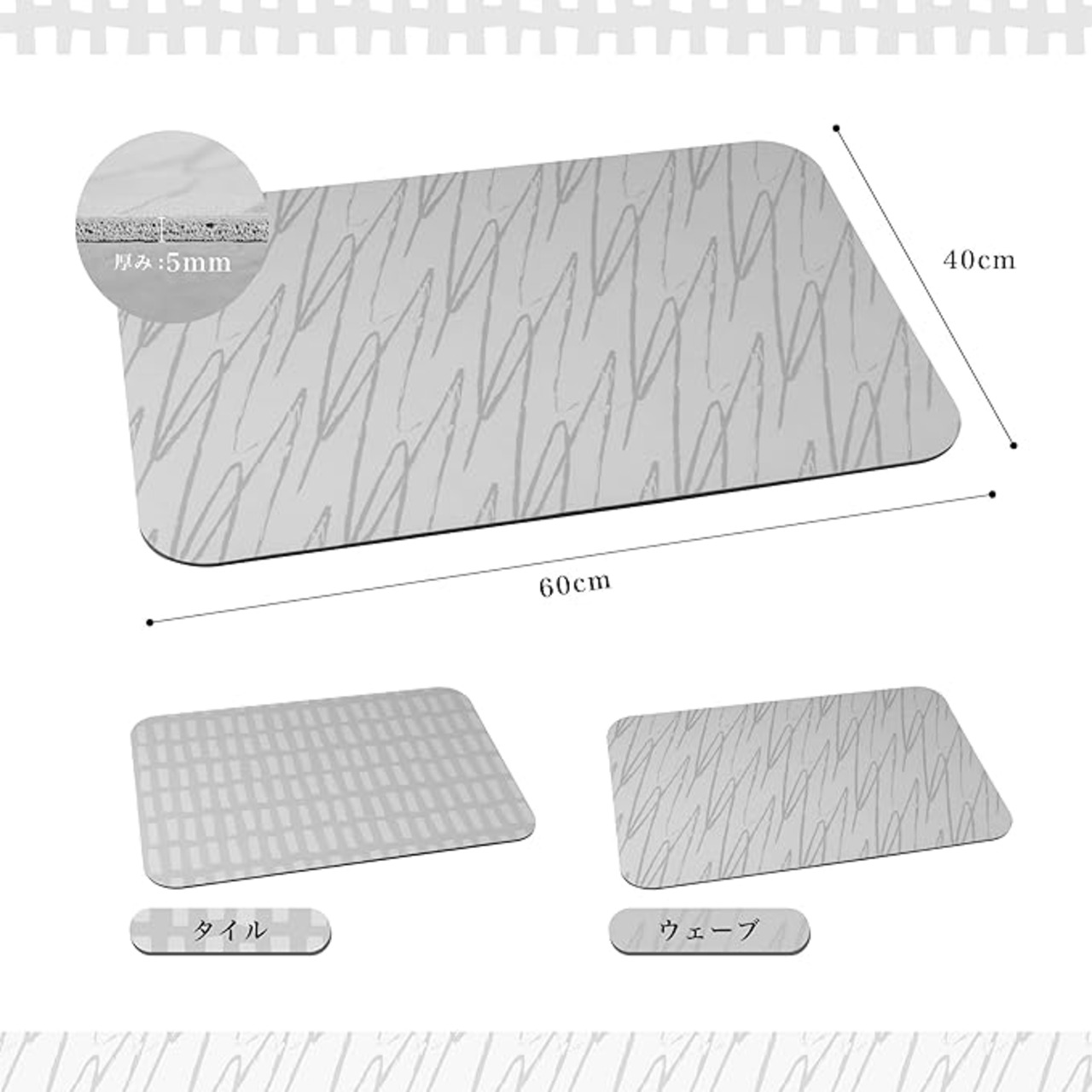 ポリウレタン・不織布・天然ゴムの3層構造で、垂れた水分をしっかり吸水!裏面は床に敷いてもズレにくいエンボス加工。