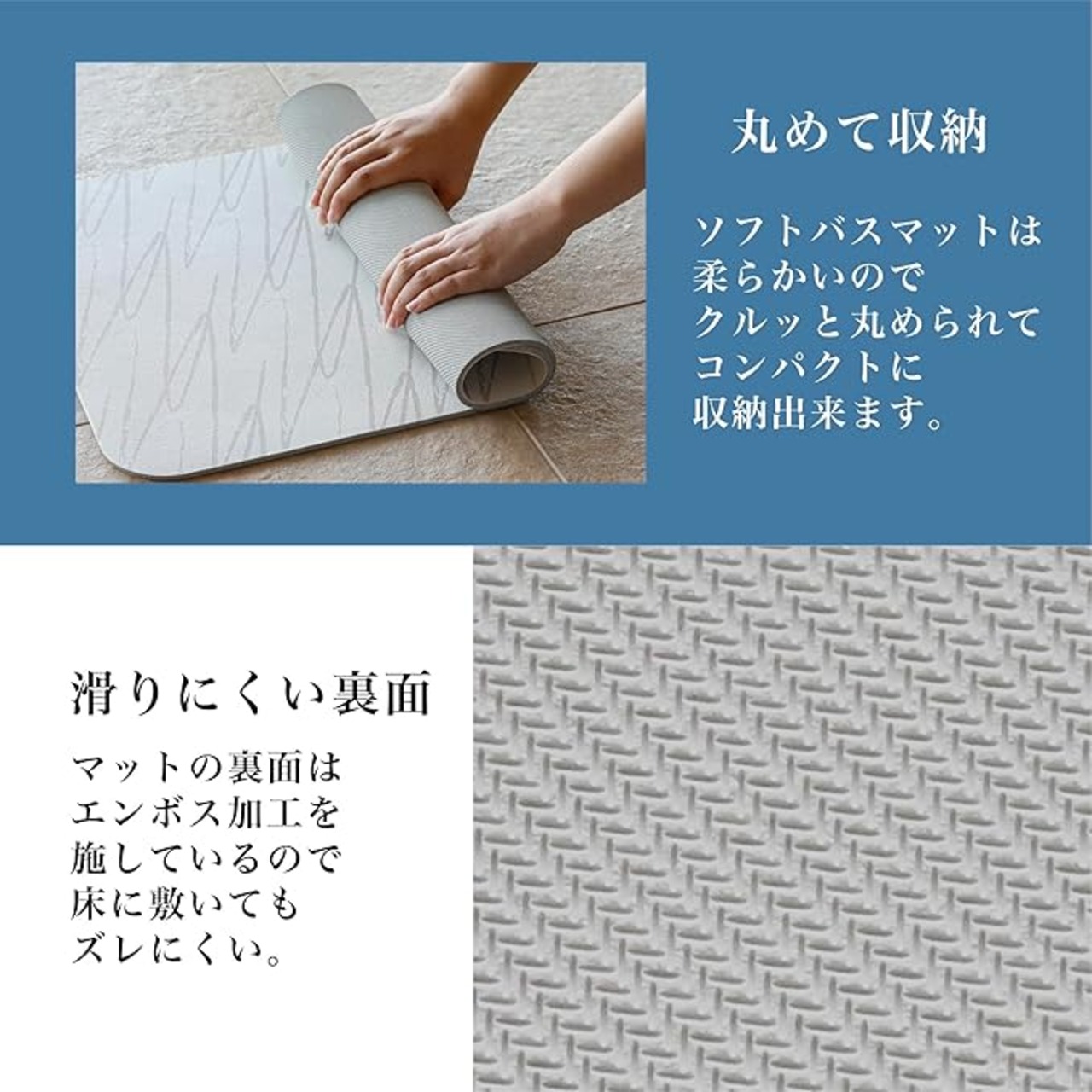 ソフトタイプのバスマットなので、丸めて収納することもできます。使用後はバスマットスタンドやタオルバーなどに干して乾燥させられるので便利です。