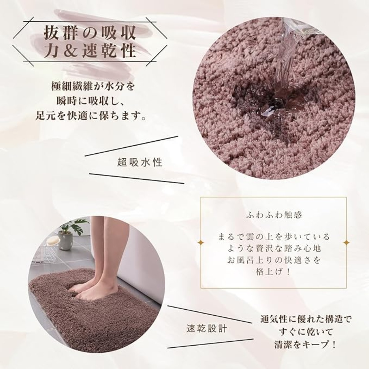 【優れた吸水性と速乾性】高密度のマイクロファイバー繊維がたっぷりの水分をすばやく吸収。濡れた足元を素早く乾かし、いつでも快適な状態をキープします。