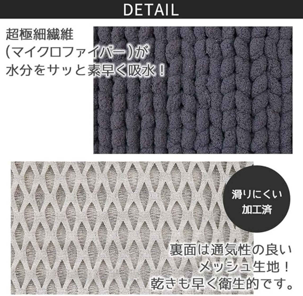 ソフトタッチでボリューム満点、足裏に心地よいふかふか感が特徴のバスマットです。超極細繊維(マイクロファイバー)が水分をサッと素早く吸水します。