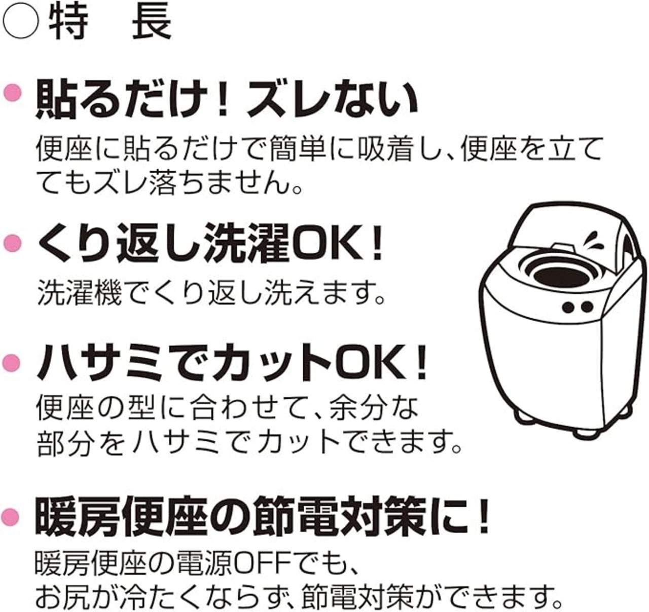 ◎トイレの便座に貼るだけで簡単に使える便座シート。便座を上げてもズレません。◎暖房便座なしでもお尻が冷えません。節電できて、地球にやさしくて経済的。◎洗濯して繰り返し使えます。◎4色入りで洗い替えに便利。◎トイレも気分やインテリアに合わせて着せ替えを楽しめます。◎O型、U型、洗浄便座、ポータブル便器にもご使用いただけます。