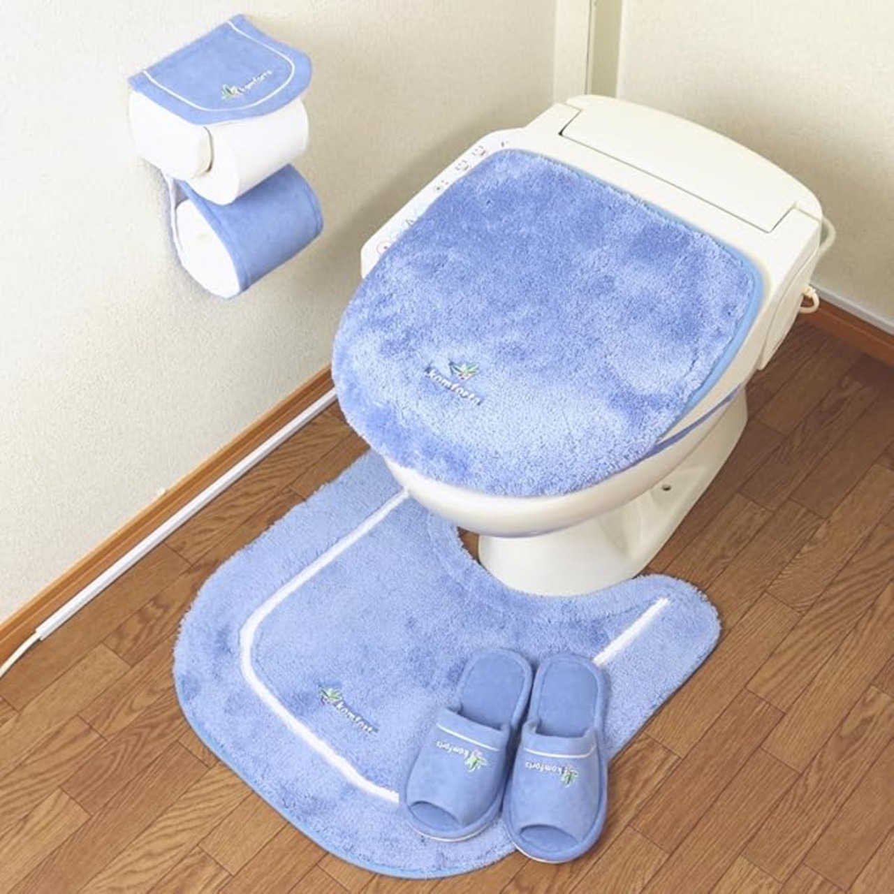 洗浄暖房型・普通型共用ふたカバー、普通サイズトイレマット、スリッパ、ペーパーホルダーカバーの4点セット。