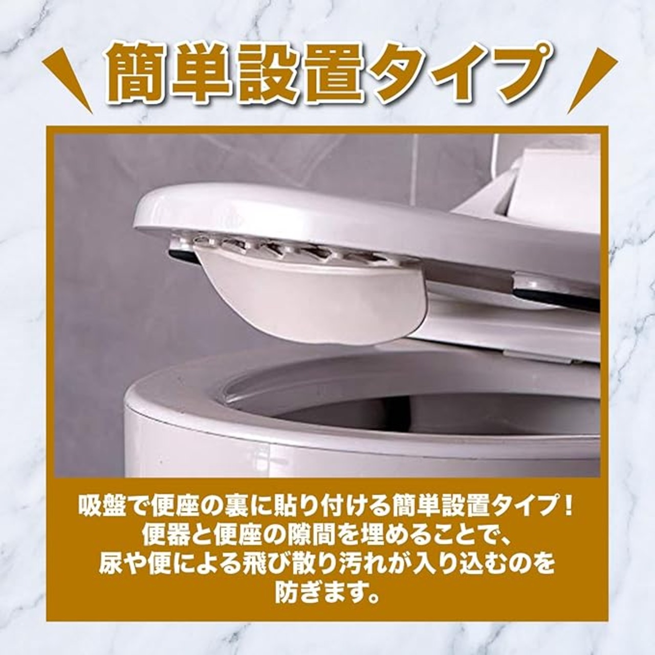 便座ウラの汚れを防ぐ!おしっこガード2個セットです。吸盤で便座の裏に貼り付ける簡単設置タイプ!便器と便座の隙間を埋めることで、尿や便による飛び散り汚れが入り込むのを防ぎます。