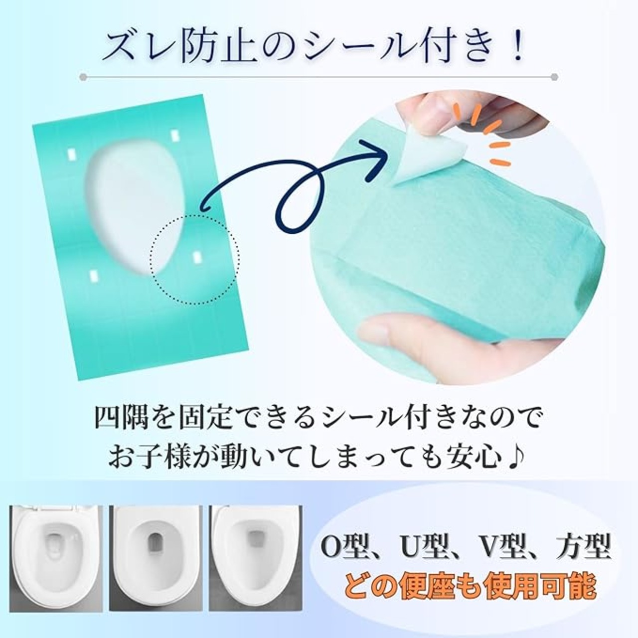 便座上でシートがずれたり外れたりするのを防げる、シート4箇所に固定できるシール付き!肌に優しい面と防水フィルムの二重構造。防水仕様なので染みてくることもありません、しっかりとした厚みで前の人が使った汚れも気にせずお使い頂けます。