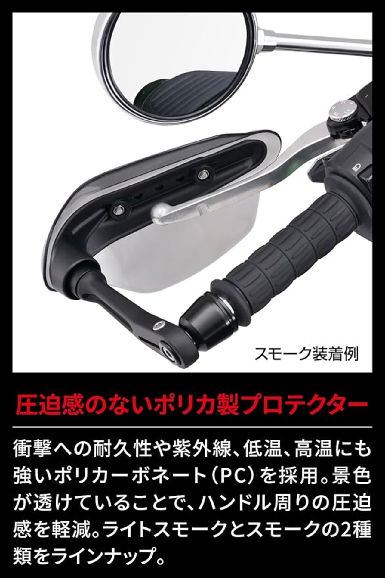 街に溶け込むスタイリッシュなデザインを採用したバーエンド固定式のハンドガード。プロテクターにはポリカーボネートを使用し、スッキリとした印象を与えつつ、優れた防風性能を発揮する。取付けは純正ハンドルバーエンドにM8ボルトで固定するだけの簡単装着。