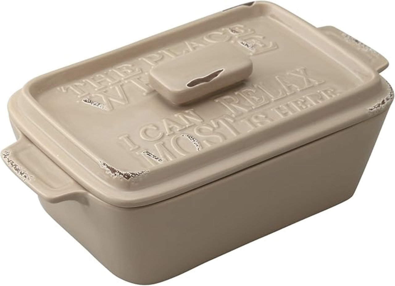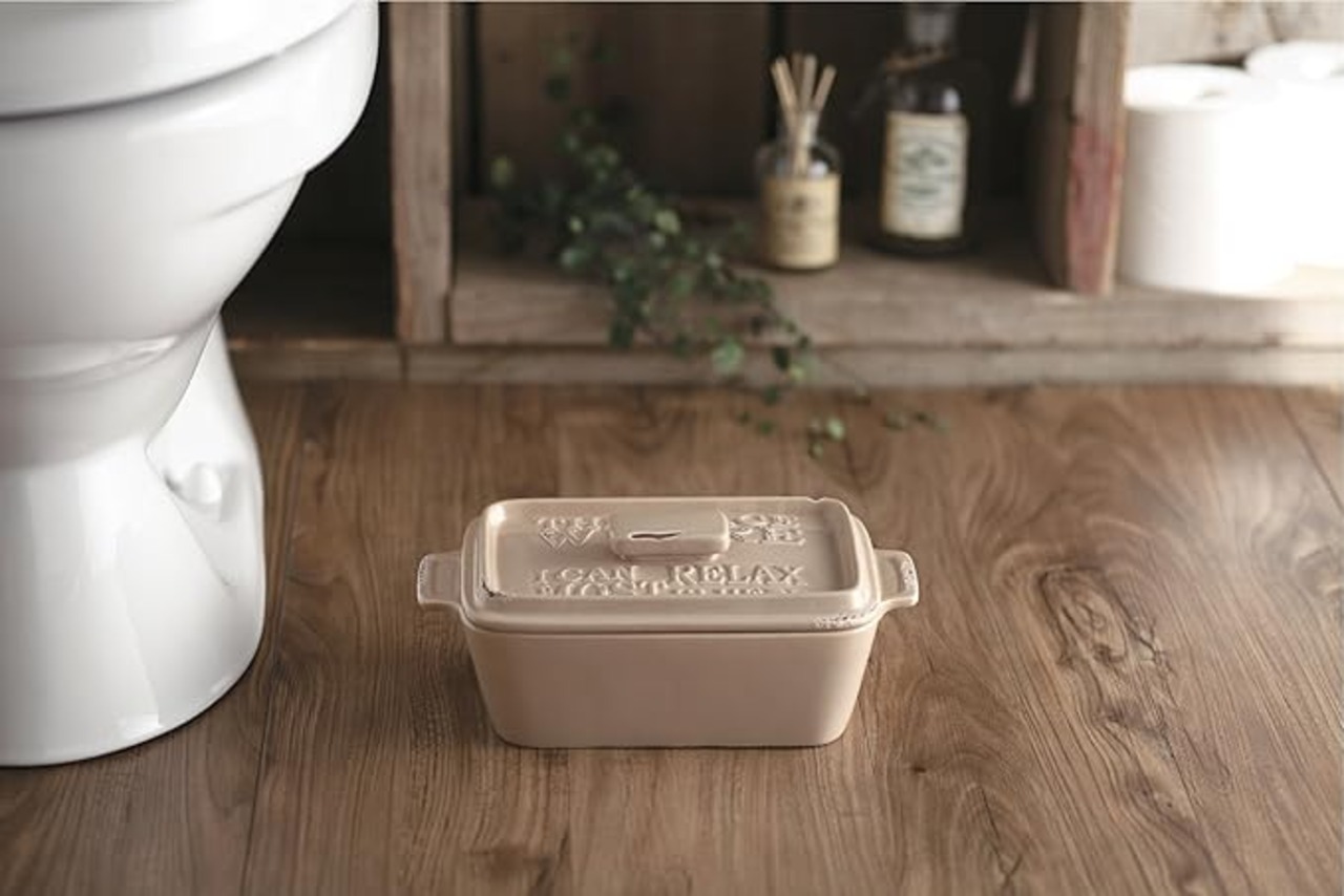 ヴィンテージボトルをモチーフにしたトイレタリーシリーズ。・まるでココット鍋のようなトイレシートケース。お尻拭きシートの収納にも最適な大きめサイズです。・プラスチックにない温もりを感じる質感は陶器ならでは。使い古された陶器のようなキズや味わい深いヴィンテージ加工がおしゃれなトイレを演出します。・サンドベージュ・・砂のようなグレイッシュなサンドベージュ。清潔感ある落ち着いたカラーは木目調やレンガ調のトイレに相性ピッタリ。