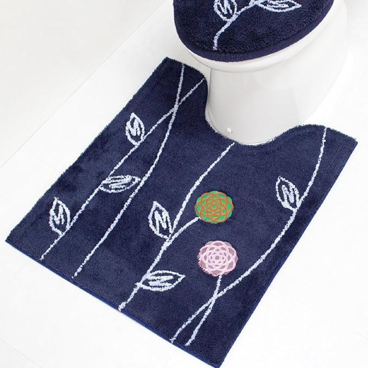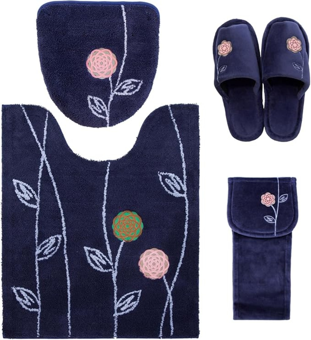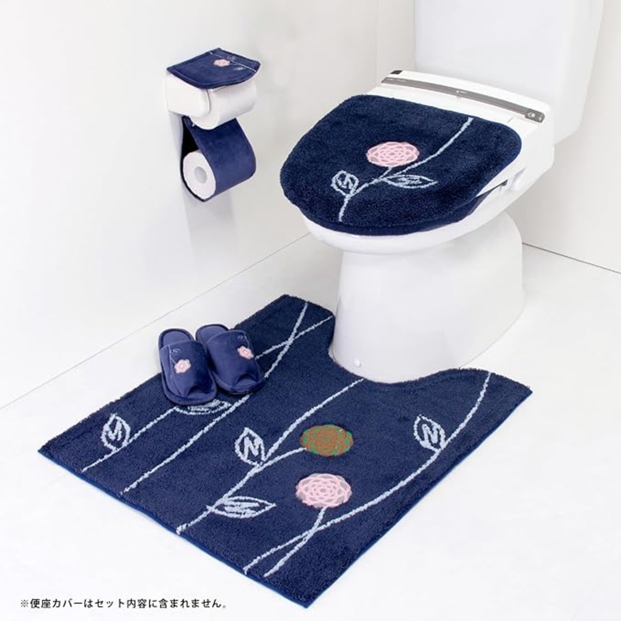 オカ(OKA) エトフトォワ ロングサイズ トイレマット 4点セット (トイレマット +洗浄フタカバー+ホルダーカーバー+スリッパ) ネイビー (4点セット 北欧 洗える 滑り止め 洗浄 暖房)