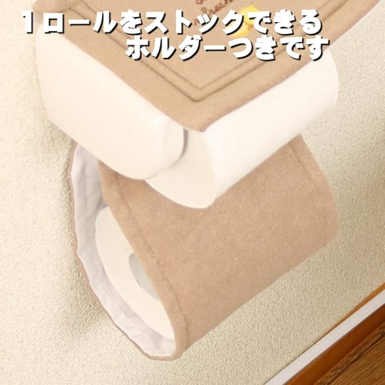 3:スリッパ 足のサイズ:約25cmまで 素材:綿75% ポリエステル25% 生産国:中国製 洗濯機での丸洗いは洗濯ネットをご使用ください。 家庭用洗剤をご使用ください。 乾燥機はご使用にならないでください。 4:ホルダーカバー 素材:綿75% ポリエステル25% 成型部品 ポリプロピレン 生産国:中国 装着可:成型部品がペーパーホルダーの隙間(※厚さ4mm以上、幅113mm以上)に差し込める場合 ※お洗濯の際は洗濯用ネットをご使用ください ※お洗濯の時は成形部品を必ず外してください ホルダー下部には予備のトイレットペーパーを1ロールストックできます。 乾燥機はご使用にならないでください。