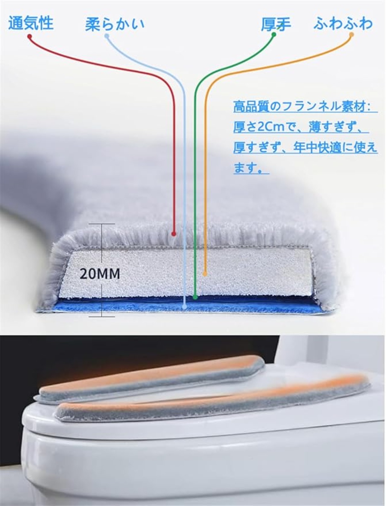 【おすすめのところ】高品質のフランネル素材は人肌に優しい、触り心地は最高です、フカフカのフランネルで便座が冷たくならず、おしりが快適。マシュマロのようなスポンジの厚さは1.5cmまで増え、シート全体は2㎝にレベルアップしました。ちょうどうよくの厚さで便座のふたの開閉も邪魔せず、日常のご使用は簡単で便利です。抗菌防臭加工も施してあるので、嫌なニオイ軽減に有効です。清潔にお使いいただけます。