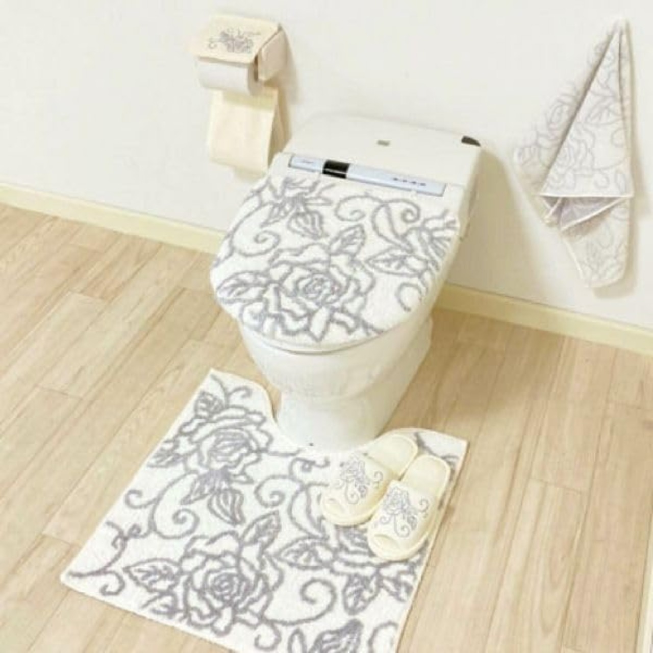 【ホワイト】トイレマット 洗浄暖房用 普通便座兼用フタカバー 含む 5点セット クリアローズ エレガントなローズ模様 薔薇 ローズ