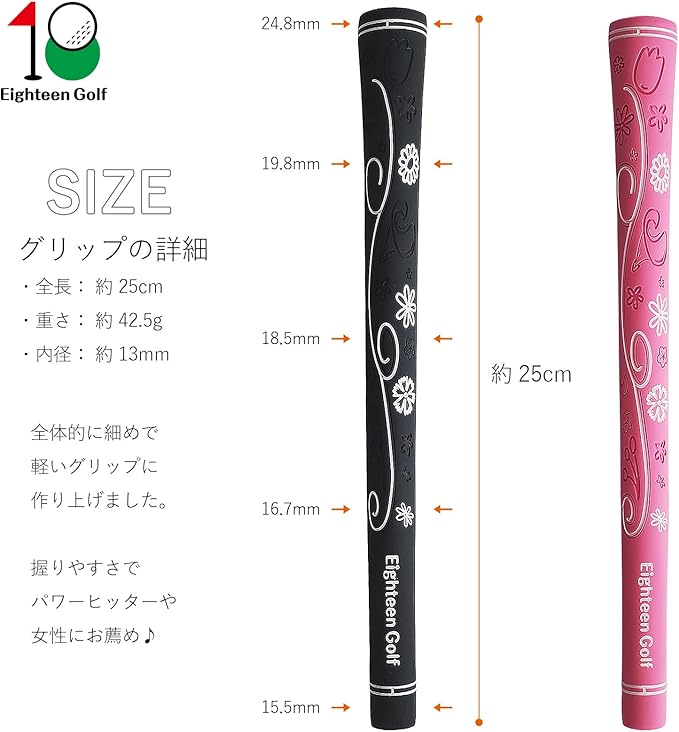 Eighteen Golf オリジナル ラバー(ゴム) グリップ セット フラワーパタンを施しながら、しっかりしたグリップ力でオシャレなグリップとなっています。