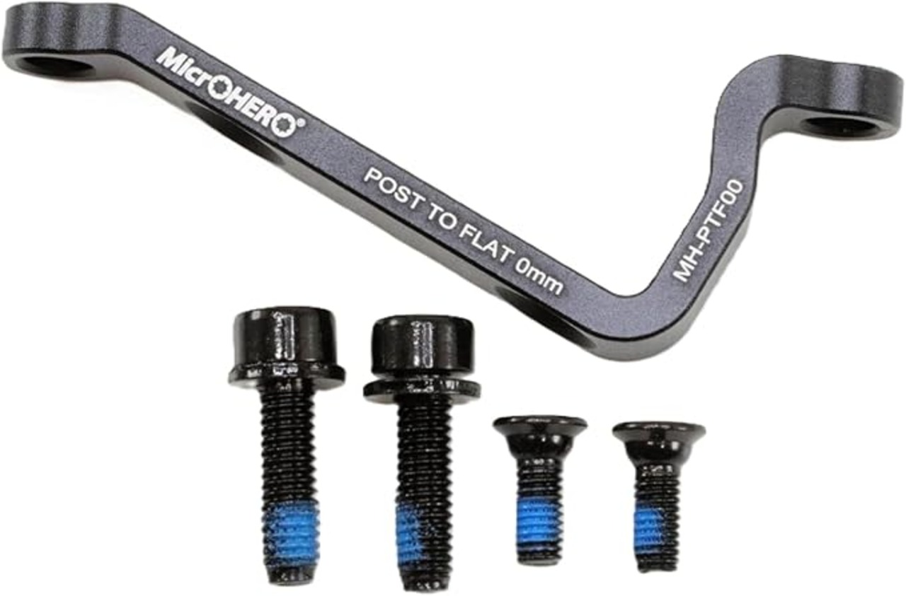 ・マイクロヒーロー(MicrOHERO)製、ポストマウントブラケットになります。 ・フォークとフレーム側のポストマウントにロード用のフラットマウントディスクブレーキキャリパーを取り付けることができます。