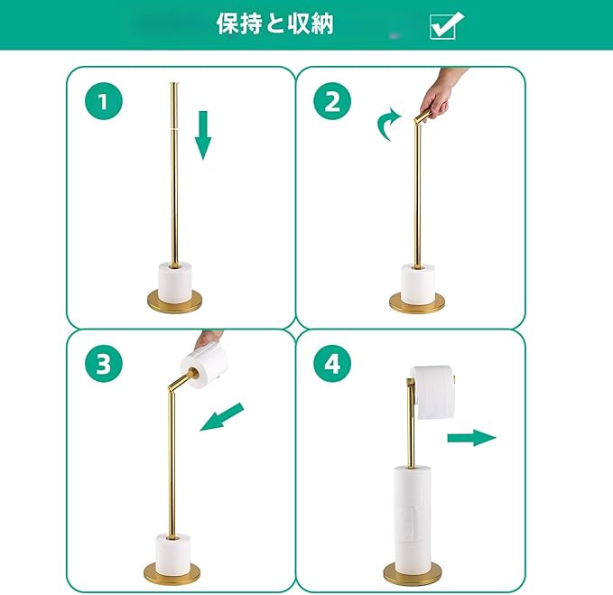 ✔ 高品質 - この自立式トイレットペーパーホルダーは高品質のステンレススチール製で、腐食に強く、錆びにくく、浴室やキッチンなどの湿度の高い環境に適しています。 ブラッシュドゴールド仕上げで、バスルームにさらなる装飾をもたらします。