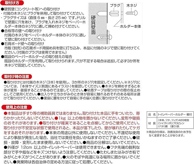 ・ドリルで壁面に穴をあけ、プラグを入れ木ネジをペーパーホルダー本体のネジ穴に通して締め付けてください。