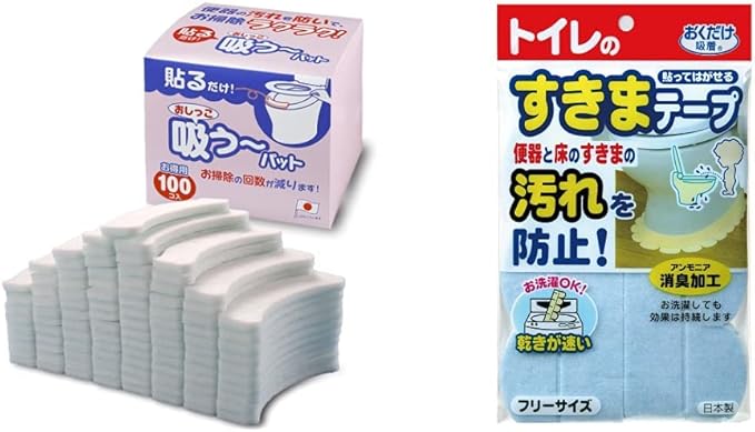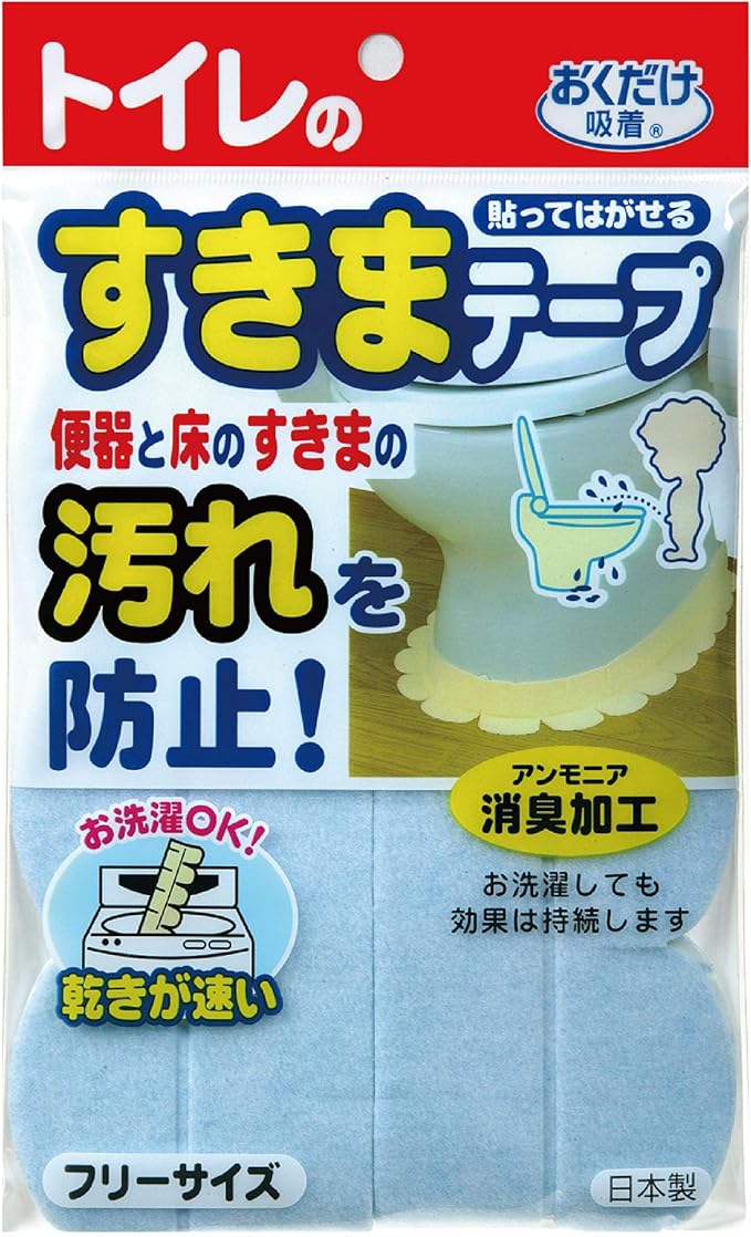 商品(右): 便器と床のすきまの汚れを防ぐテープ2枚入りです。便器から垂れてきたおしっこを吸収、またホコリや汚れも防止します。
