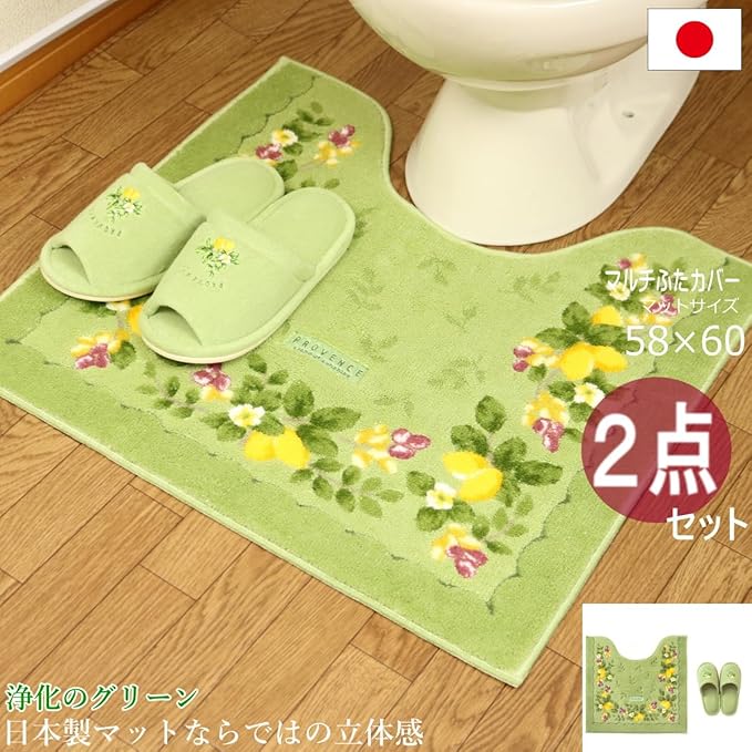 ●普通サイズトイレマット、スリッパの2点セット。 ●丸洗いができるのでいつも清潔です。●ナチュラルなテイストを表現したトイレタリー。 ●日本製ならではのカーヴィング技法で、立体感を表現。 ●日本製ならではのカーヴィング技法で、立体感を表現。 ●マットとふたカバーは日本製です。 ※オカ プロヴァンス グリーン