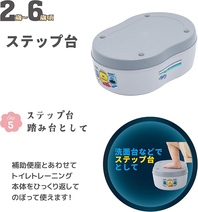 ●ステップ台、おまる、補助便座、前後のご使用で5種類の使い方ができ、お子様の成長にあわせて長期間使用できます。
