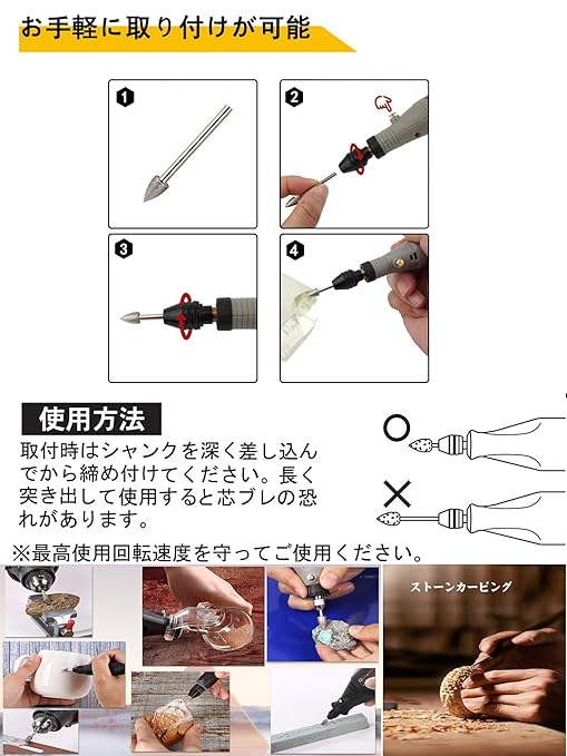 【お手軽に取り付けが可能】: 本製品を電動ルーターの先端に取り付け、本体のスイッチを押すと、すぐご使用いただけます。ミニルーターやハンドドリルに取り付けることができる研削用ダイヤモンドビットセットとなっております。特に力がいる事や難しい作業はございませんので、初心者の方でも安心してお使い頂けます。研削加工をしやすくするためにも取り入れてみてはいかがでしょうか?